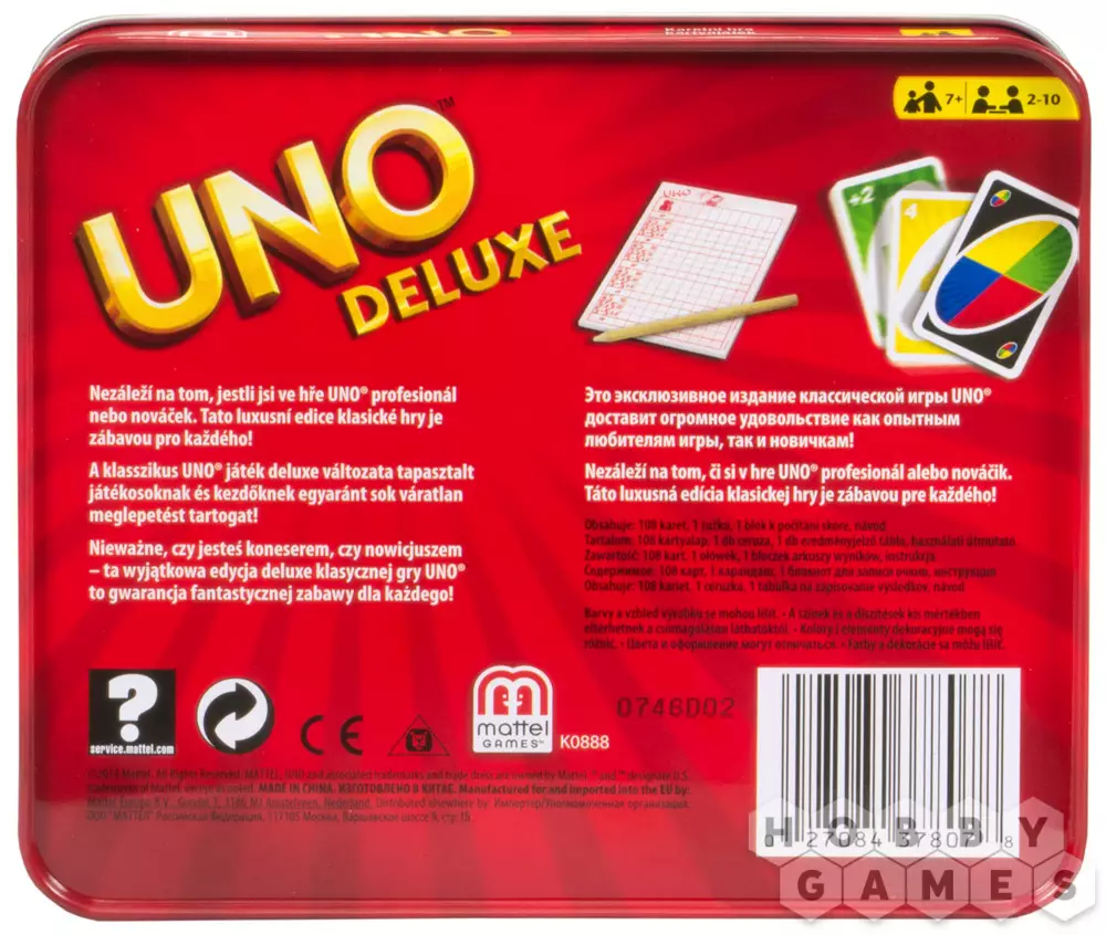 Издание "УНО Делюкс" предлагает вам уникальную упаковку для хранения игры и её компонентов, специальную подставку для колод, блокнот и карандаш для удобного подсчёта очков, а также уникальную рубашку на самих картах.