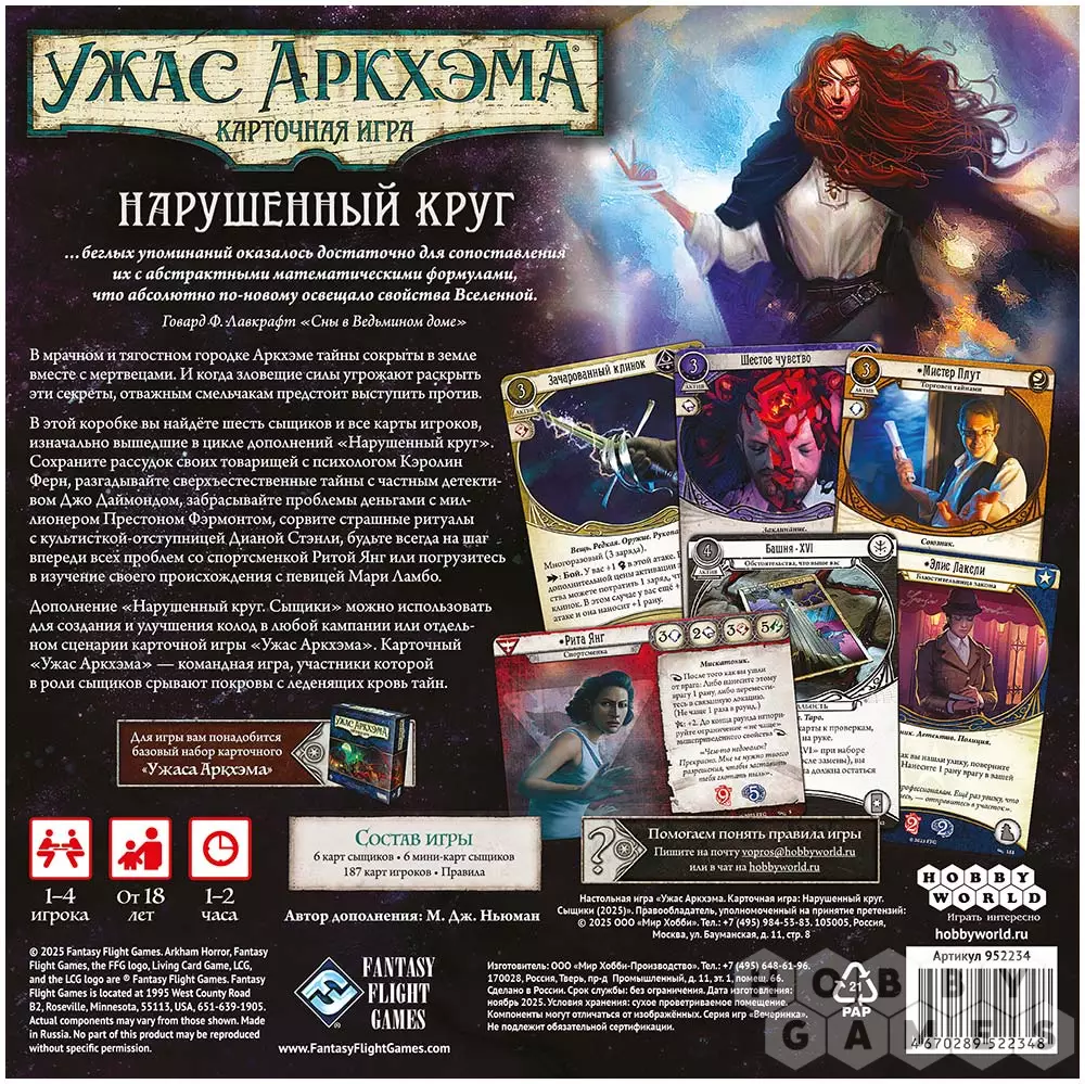 Коробка "Нарушенный круг. Сыщики" включает в себя 6 сыщиков и все карты игроков, которые ранее выпускались в составе отдельных наборов цикла "Нарушенный круг". Попробуйте разгадать сверхъестественные тайны вместе с частным детективом по имени Джо Даймонд. Со спортсменкой Ритой Янг вы будете оказываться на шаг впереди любой проблемы. Но если проблемы всё-таки одолеют, решить их помогут деньги, а с деньгами поможет миллионер Престон Фэрмонт. Постарайтесь не потерять рассудок и помогите сохранить его вашим товарищам вместе с психологом Кэролиной Ферн. Свой человек в рядах культистов – отступница Диана Стэнли – поможет вам сорвать ужасные ритуалы. А вместе с певицей Мари Ламбо изучите собственное происхождение. Что бы в Аркхэме ни происходило, в центре событий всегда окажутся смелые сыщики. Ваша задача, как и всегда, не дать им сойти с ума.