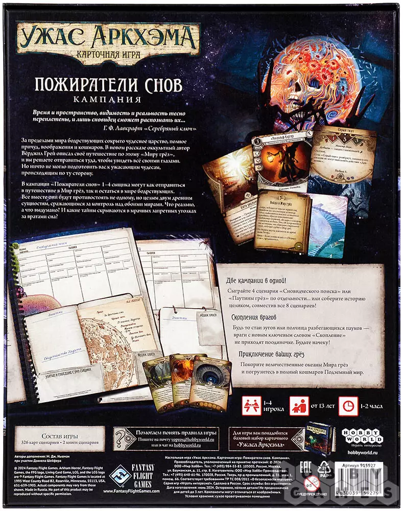 В кампании "Пожиратели снов" команда сыщиков отправятся в путешествие по Миру грёз или останутся в мире бодрствующих, чтобы защищать его от тьмы. Вам предстоит противостоять не одному, а целым двум древним сущностям, сражающимся за власть над обоими мирами. Где реальность, а где выдумка? Какие тайны скрываются в запретных уголках за вратами сна?