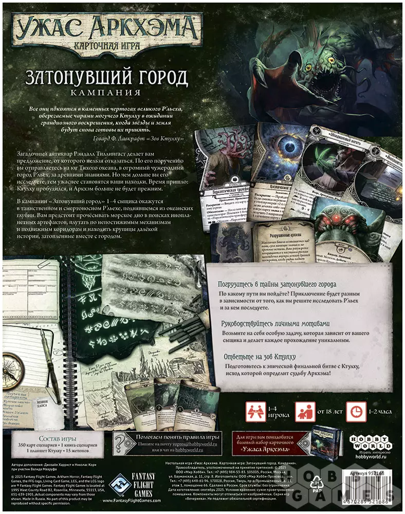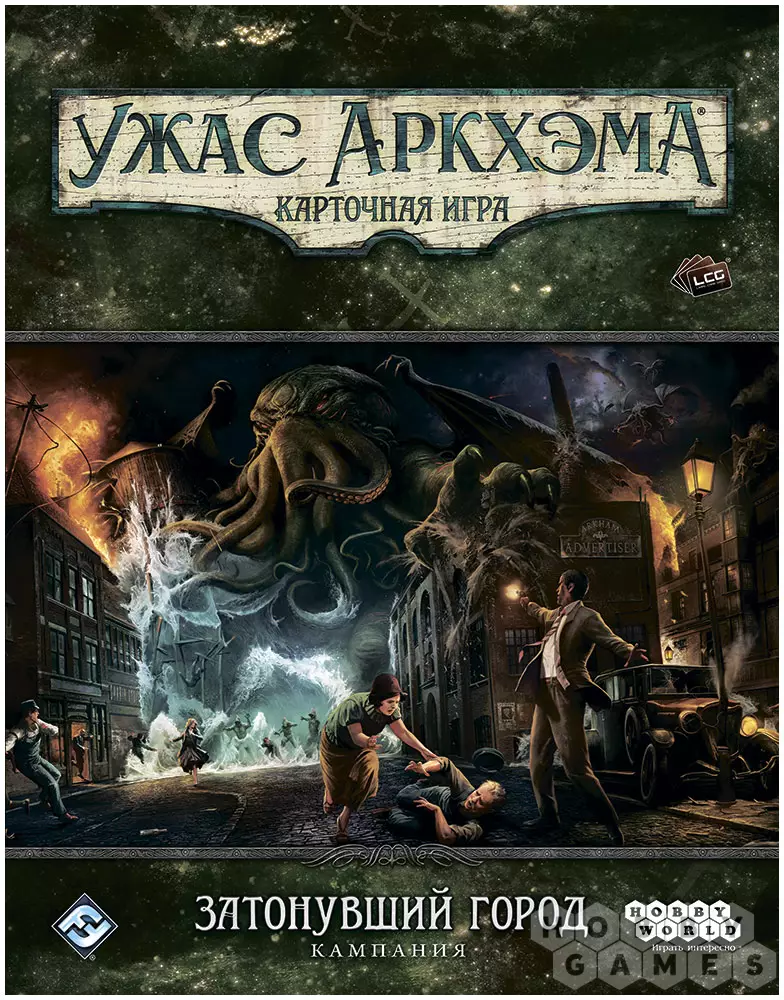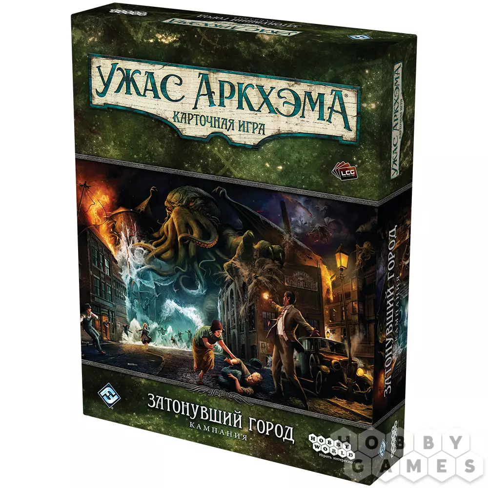 "Затонувший город" – масштабная сюжетная кампания для карточной игры "Ужас Аркхэма", где вас ждёт совершенно новое приключение. Вы будете плутать по меняющимся локациям Р’льеха, исследовать морское дно в поисках инопланетных реликвий и принимать решения, которые определят ход истории.