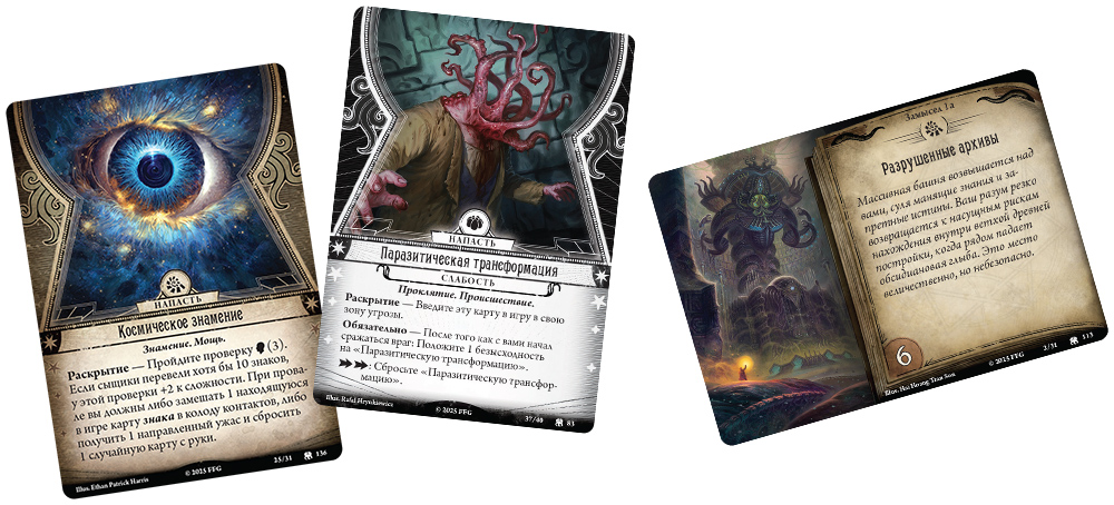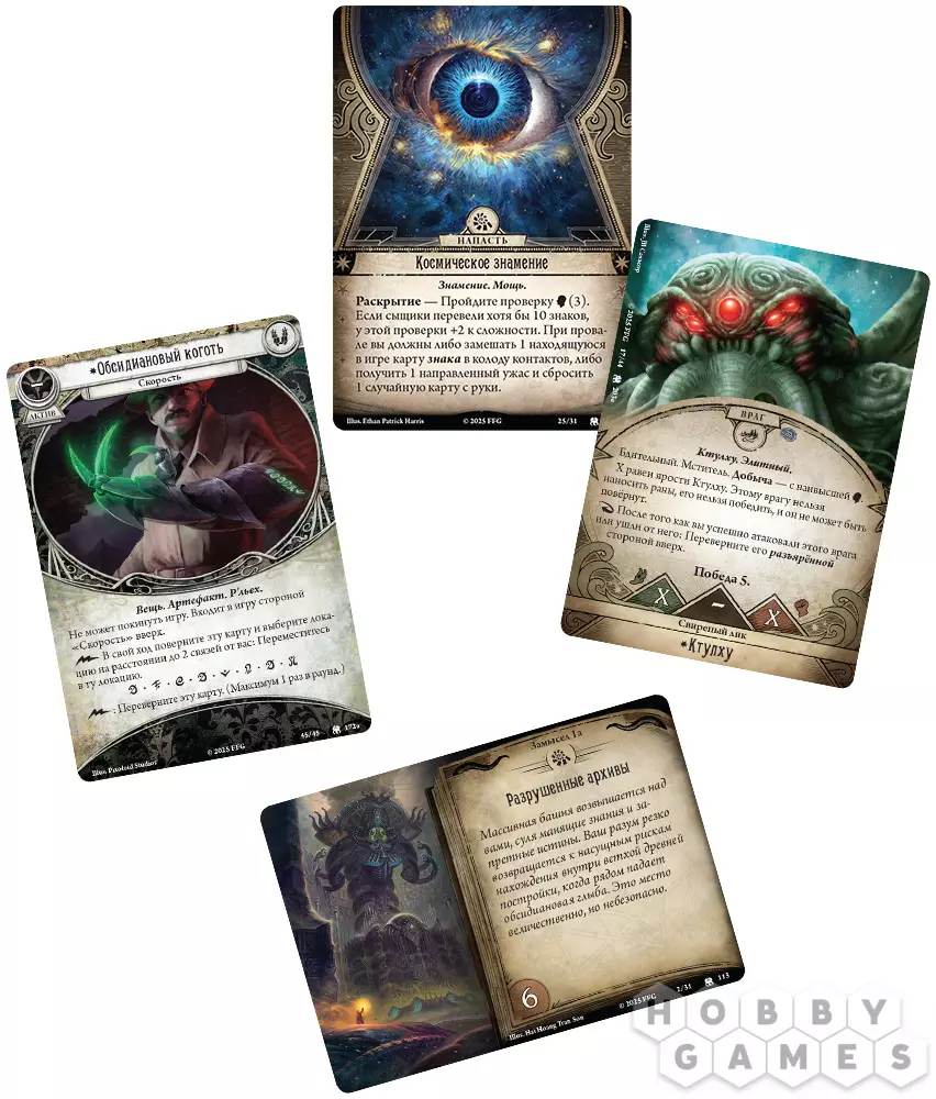 Игроки управляют действиями персонажей посредством своей колоды сыщика. Сценарии ведут кампании, предлагая интереснейшее приключение.