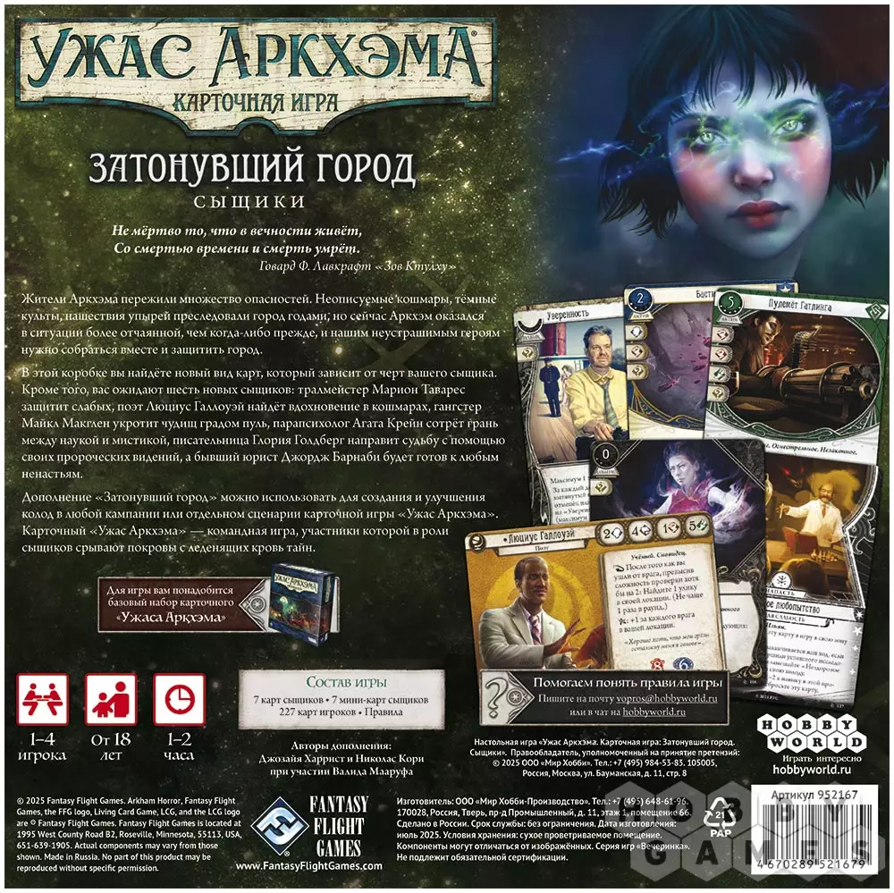 "Ужас Аркхэма. Карточная игра" – это кооперативная Живая Карточная Игра в сеттинге мифов Лавкрафта, в которой 1-2 сыщика (а со вторым набором – 3-4) совместно познакомятся с миром оккультизма, древних богов и тайн, параллельно борясь и с внутренними демонами из своего прошлого.