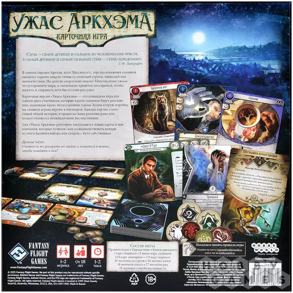 "Ужас Аркхэма. Карточная игра" – это кооперативная Живая Карточная Игра в сеттинге мифов Лавкрафта, в которой 1-2 сыщика (а со вторым набором – 3-4) совместно познакомятся с миром оккультизма, древних богов и тайн, параллельно борясь и с внутренними демонами из своего прошлого.