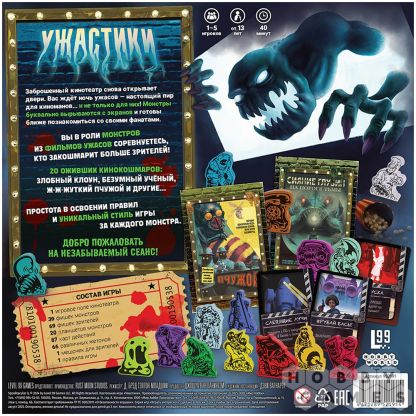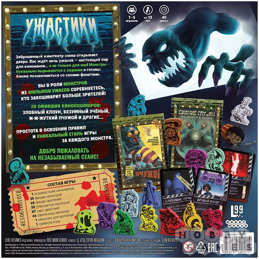 "Ужастики" – это весёлая и динамичная настольная игра, в которой вы примерите роль одного из двадцати оживших кинокошмаров. Ваша цель – напугать как можно больше зрителей и доказать, что именно вы – главная звезда этого хоррор-фестиваля! Выбирайте своего уникального монстра и используйте его особые способности, чтобы обойти соперников. Простые правила позволяют сразу погрузиться в хаотичную и весёлую гонку за зрителями, где всё решает ваша тактика и немного везения. Идеальный выбор для дружеской посиделки, которая подарит море эмоций и смеха.