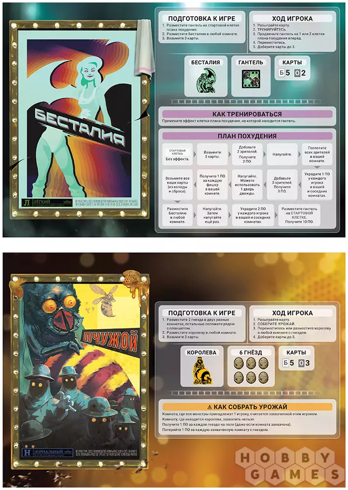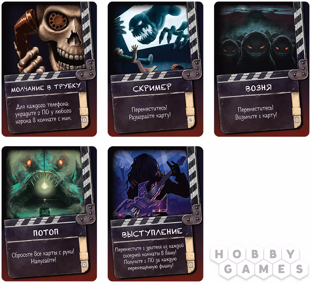 Выберите одного из двадцати монстров и получите его персональный планшет с особыми способностями. Ваша главная задача – сеять панику среди зрителей, накапливая победные очки (ПО) через запугивание и хитрые комбинации. Каждый ход вы будете: