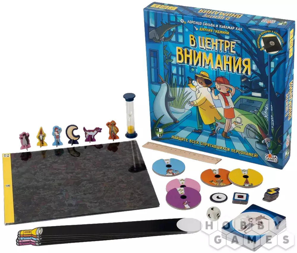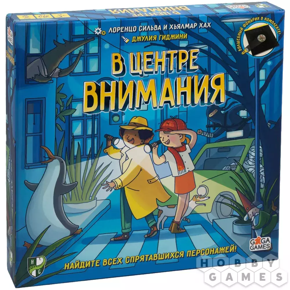 "В центре внимания" – это динамичная игра, которая покорит как детей, так и взрослых. Приготовьтесь проверить свою внимательность! Ваша задача – с помощью особого фонарика, который никогда не сможет потухнуть, обнаружить как можно больше персонажей и объектов до того, как взойдёт луна. Каждая партия – это как настоящие прятки, в которых вы водите и пытаетесь найти все места для укрытия. На планшетах с красочными изображениями целая куча любопытных деталей – даже после десятков партий вы наверняка да найдёте что-то новое.