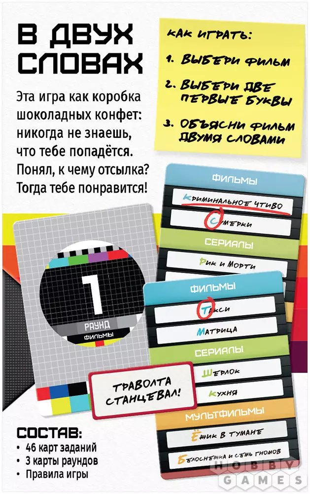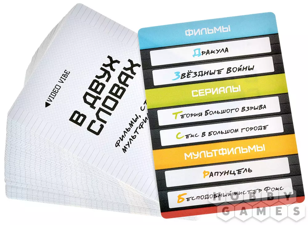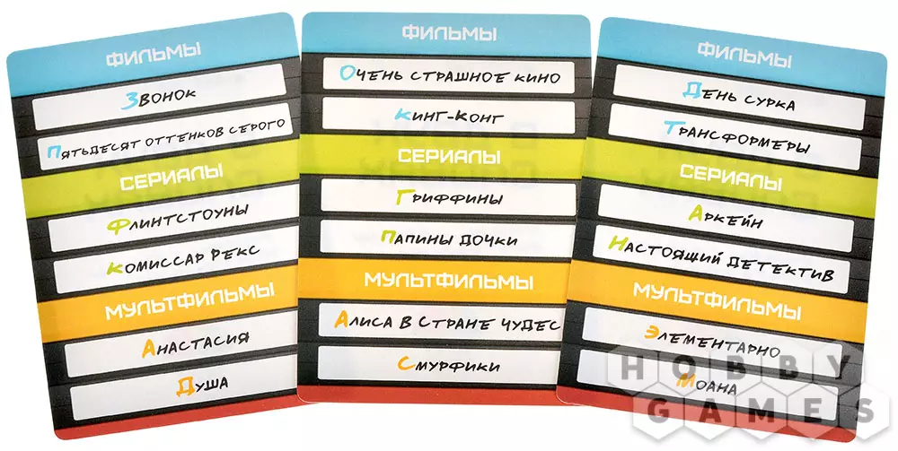 В зависимости от того, какой сейчас раунд, вы выбираете одно из этих названий из соответствующей категории. Теперь посмотрите на названия оставшихся трёх: они начинаются с цветных букв. Вам нужно выбрать две из трёх возможных букв и придумать с их помощью какое-то словосочетание или просто два несвязанных друг с другом слова, которые помогут остальным игрокам угадать выбранную вами ленту.