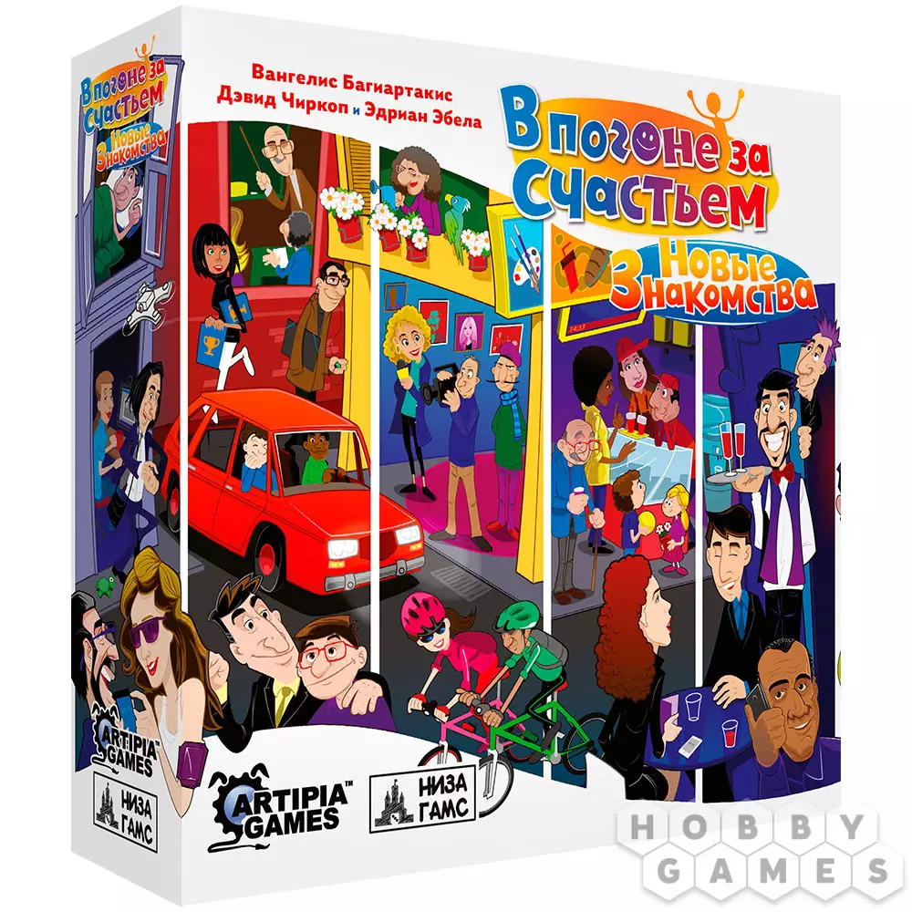"В погоне за счастьем: Новые знакомства" – это дополнение, которое добавляет в игру местное сообщество. Новый тип карт – карты сообщества – позволяет игрокам участвовать в различных событиях и определять их исход. Для них предусмотрено дополнительное игровое поле, а также система рейтинга популярности, который будет отражать вашу репутацию.