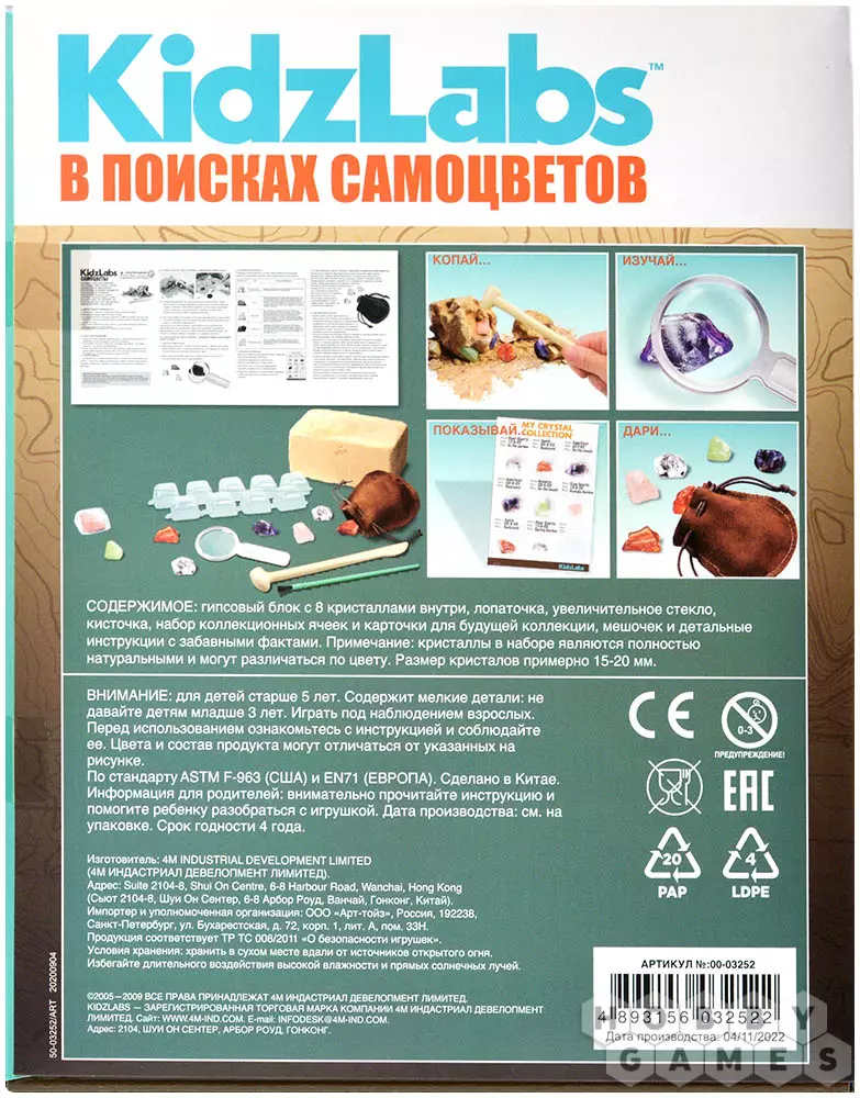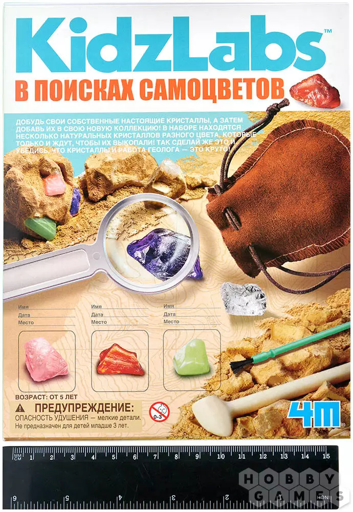 "В поисках самоцветов" – это необычный и очень интересный набор, который познакомит детей и взрослых с увлекательным процессом раскопок. С его помощью вы собственными руками добудете из гипсового блока 8 самых настоящих кристаллов! В состав уже входит всё необходимое для предстоящих работ.