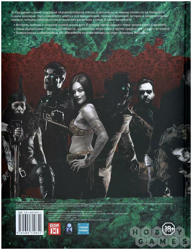 "Предания кланов" – это дополнительная книга для классических правил НРИ "Вампиры: Маскарад", что содержит множество информации о Мире Тьмы и его загадочных обитателях. Под обложкой вы найдёте тексты, персонажей и экспозицию, которую можно использовать в партиях.