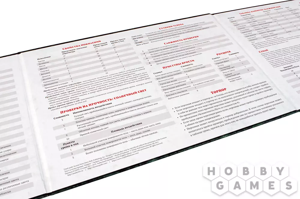 Эта ширма ведущего для настольной ролевой игры "Вампиры. Маскарад" содержит на себе множество полезной информации об основных игровых механиках: уровнях здоровья, фазах сражений, проверках на прочность и свойствах разных поколений вампиров, манёврах ближнего и дистанционного боя и даже иерархию грехов. Ведущему она поможет не только помнить основные правила, но и скрывать броски кубиков от игроков. На лицевой стороне ширмы – классическая эмблема "Маскарада" и арт на вампирскую тематику.
