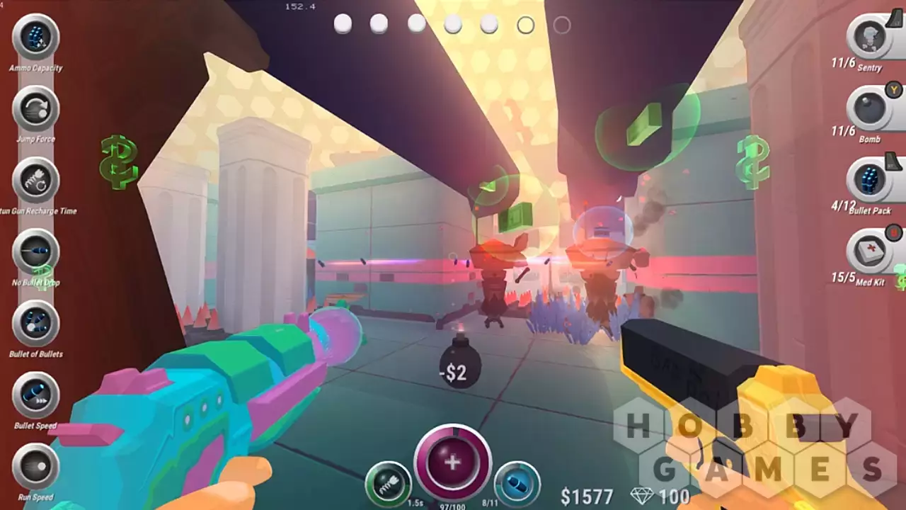Most objects are physically simulated. Your bullets have weight and can ricochet around. Getting punched by a heavy enemy will push you away, jumping into a wall will bounce you back. Enemies can also be punched out of your way.