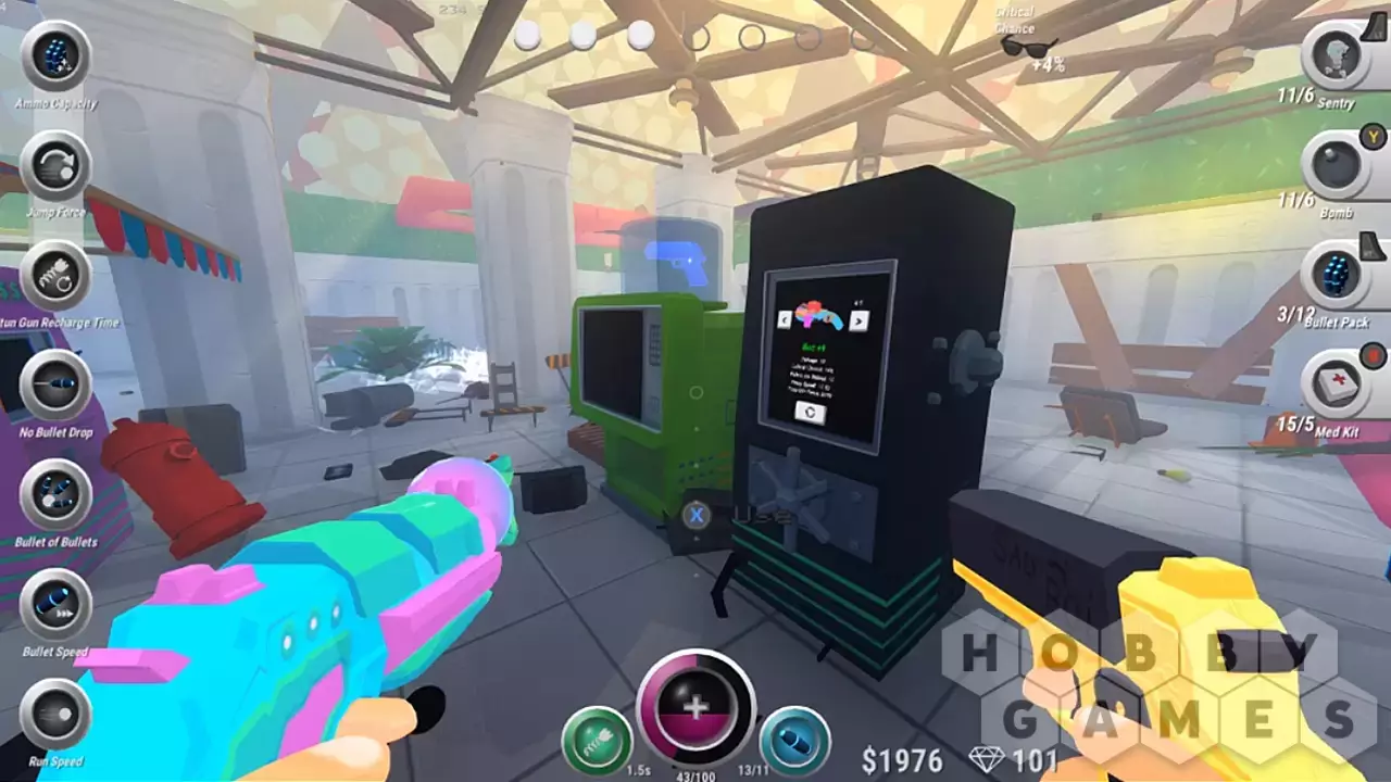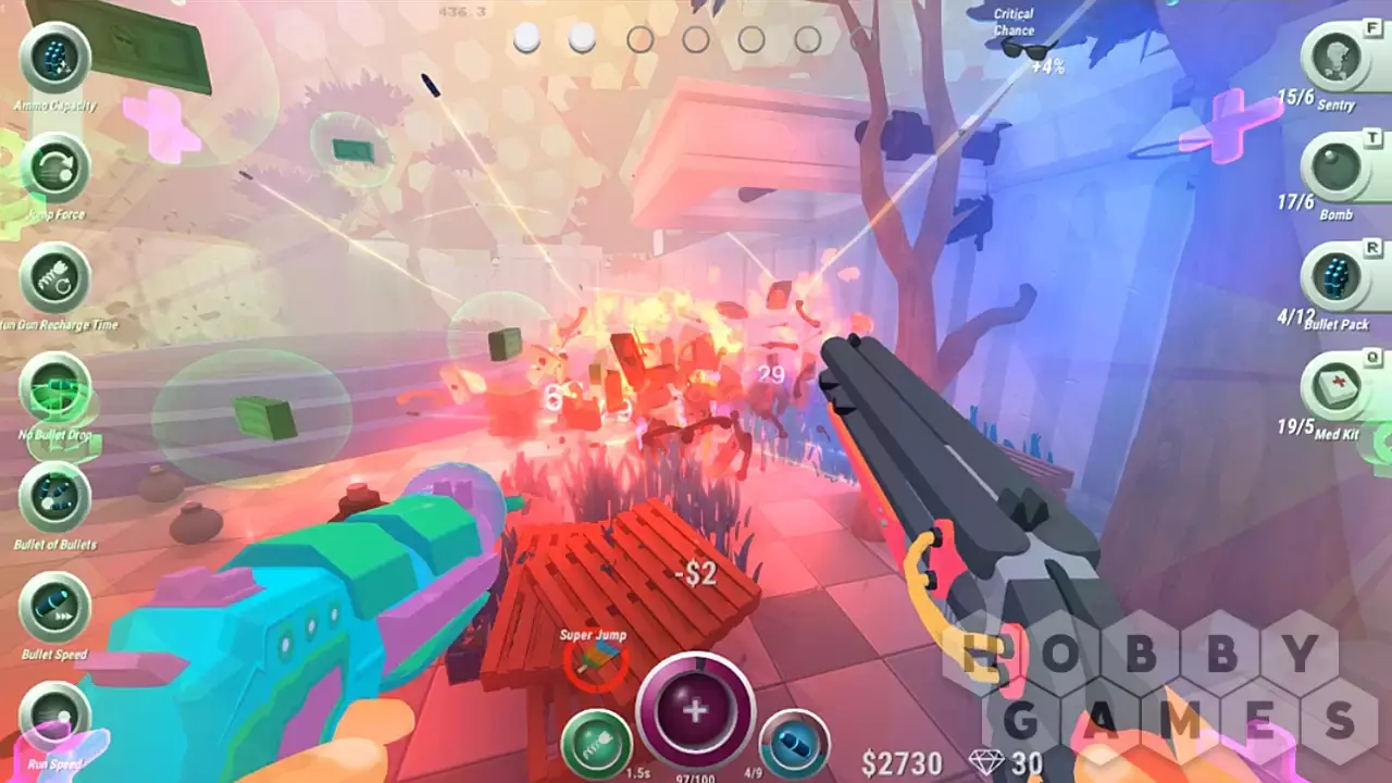 You can buy a plethora of different upgrades to increase your powers. All upgrades work simultaneously and stack with each other. e.g. if you got Multiply Bombs and Bomb Bullets, you're gonna throw multiple bombs and each of them will explode into bullets.