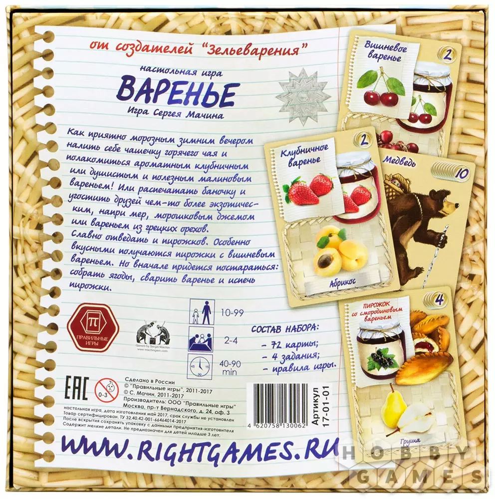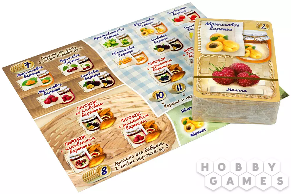 Итак, в нашей игре нужно варить разнообразные варения и печь пирожки. В начале игры каждый игрок получает 4 карты из колоды (это "рука" игрока) и карточку заданий, на которой изображены комбинации варений и пирожков, за которые можно получить дополнительные очки в конце игры. Игроки получают победные очки за выполненные задания, а также за все сваренные варенья и испеченные пирожки. Тот, у кого в конце игры окажется больше всего очков, становится победителем.