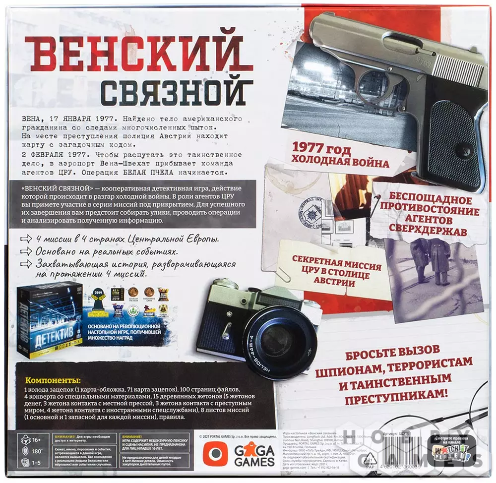 "Венский связной" – это кооперативная настольная игра, которая вобрала в себя шпионские игры, зашифрованные поручения и детективные расследования. Действия игры разворачиваются в Европе семидесятых годов прошлого века. Вы – шпионы, агенты под прикрытием, чья цель – успешное выполнение порученных миссий. Во время их выполнения вам предстоит путешествовать из одного европейского города в другой, искать в них информаторов и собирать разведданные. На старте игры вам доступны колода карт и некоторое количество зацепок, с их помощью вы и будете получать новую информацию. Только это не так просто, как может показаться: вам придётся изучить не одну кипу архивных документов, начиная с обычных вырезок из газет вплоть до секретных досье и протоколов. Работа в команде – это основное, чему вам предстоит научиться. Каждую минуту вы будете получать от игры не самые лёгкие задачки, решение которых непременно будет зависеть от уровня вашей сплочённости. Коды и шифры, встречающиеся на всём пути прохождения, с головой погружают в атмосферу шпионажа полную секретности.