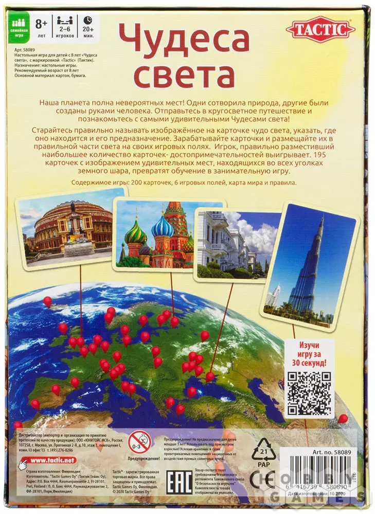 На нашей планете так много чудес и необычных достопримечательностей, что не хватит и целой жизни, чтобы увидеть их все. К счастью, благодаря настольной игре "Чудеса света", вы сможете познакомиться с большинством из самых известных чудес в формате весёлой и увлекательной викторины для всей семьи.
