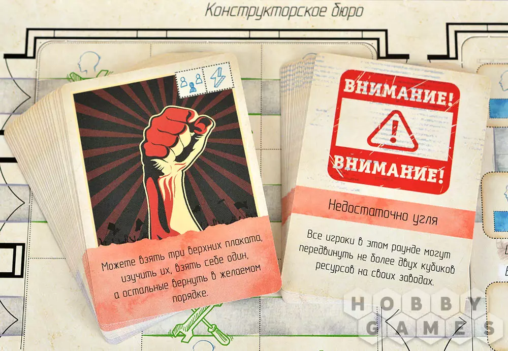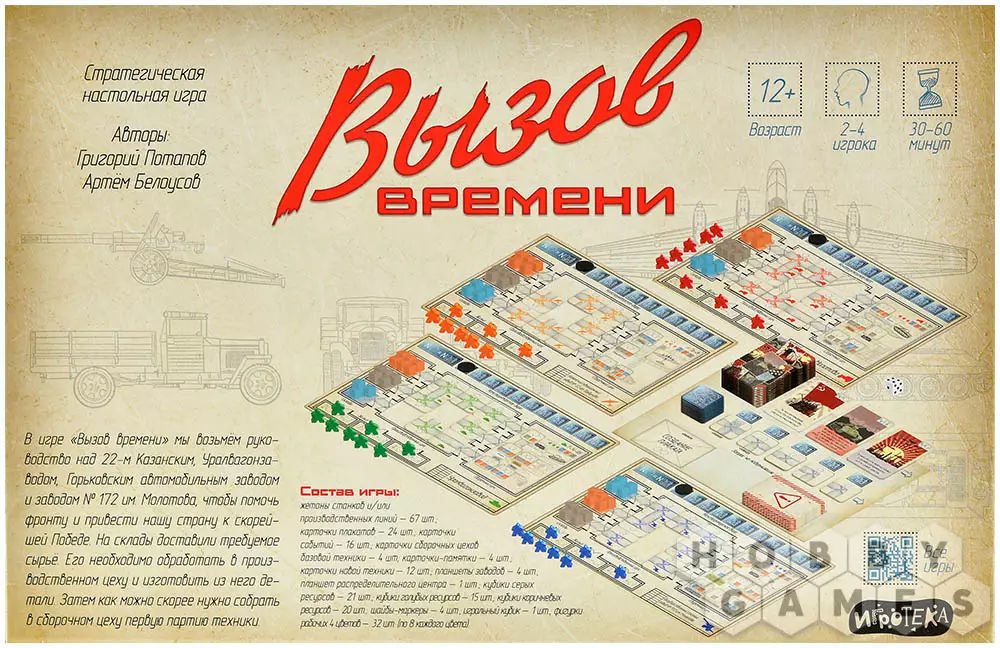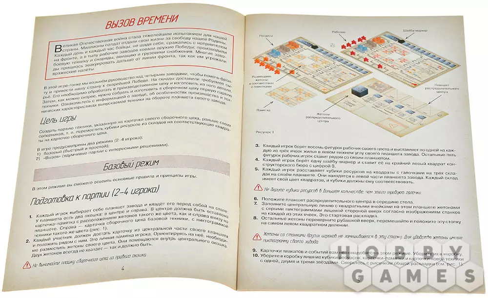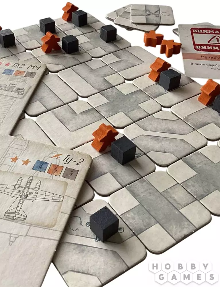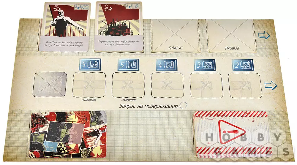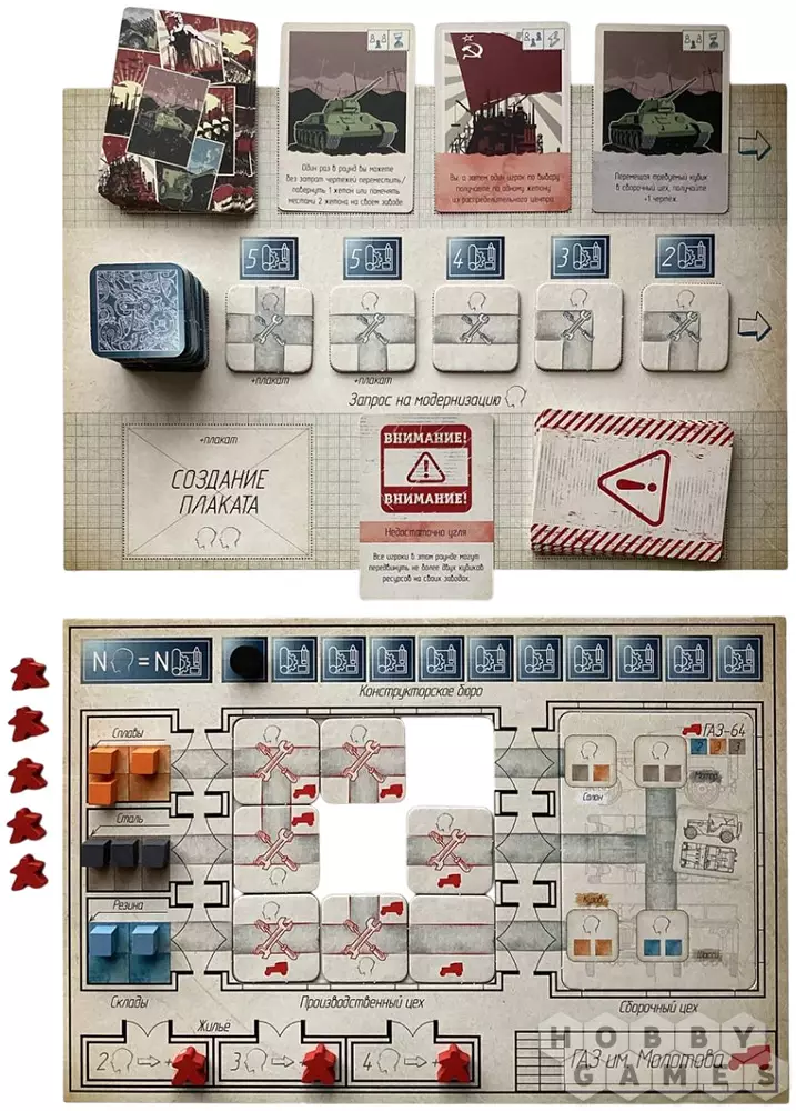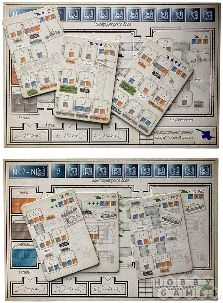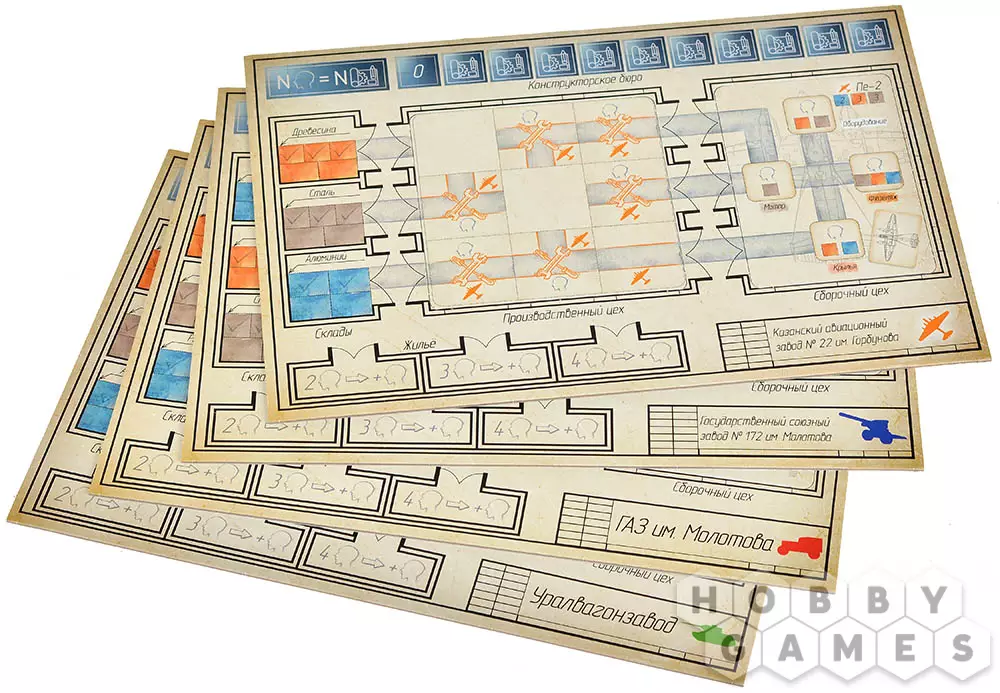 На обороте планшета каждого завода указаны особенности производства и характеристики выпускаемой техники. Цель игры – первым выполнить заказ: переместить кубики ресурсов со складов на карточку сборочного цеха согласно заданию. Кто быстрее соберёт свою партию – тот и победил!