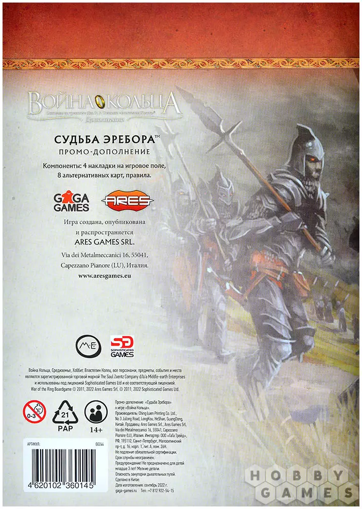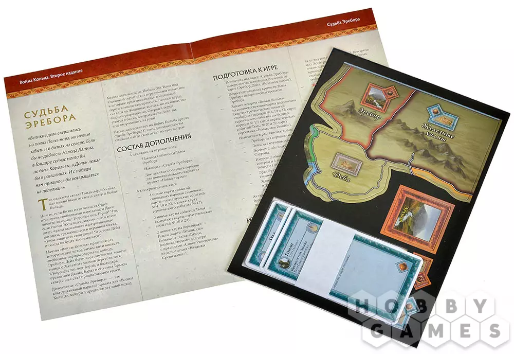 "Судьба Эребора" – это дополнение, которое связывает воедино сюжет "Битвы пяти воинств" и "Войны Кольца: Второе издание" и предлагает вам альтернативный исход битвы пред Одинокой горой. Используйте накладки на игровое поле, чтобы лёгким движением руки изменить политическую ситуацию, и попробуйте спасти Средиземье от разрушения, следуя новым правилам!