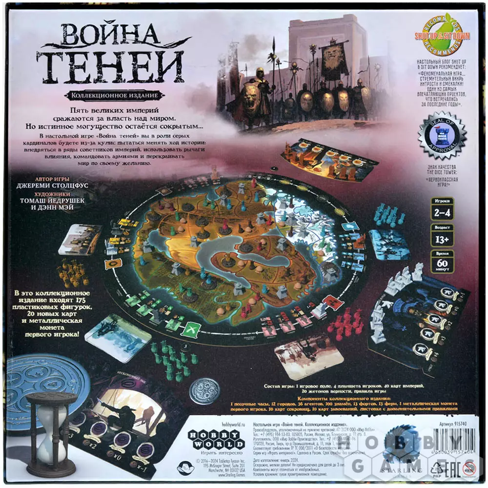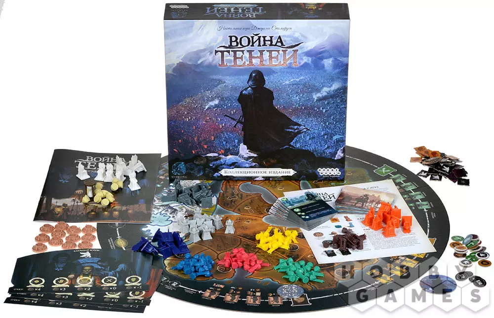 "Война теней. Коллекционное издание" – это стратегическая игра о сражении пяти великих империй за власть над миром. Вы окажетесь в самом центре этих событий, но не в роли сильного правителя одной из держав: под вашим началом будет одно из тайных обществ, что сделало ставку на происходящую войну, дабы извлечь из текущих событий собственную выгоду. В игре вам предстоит оказывать влияние на все империи сразу, отправляя в советы государств своих агентов. Но ваша организация не единственная в своём роде: другие игроки также будут оказывать влияние на действие держав, а значит, что придерживаться одной стратегии не получится. Искусно меняйте стороны, подтасовывайте карты и манипулируйте событиями, чтобы достигнуть победы в этой "Войне теней"!