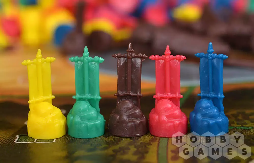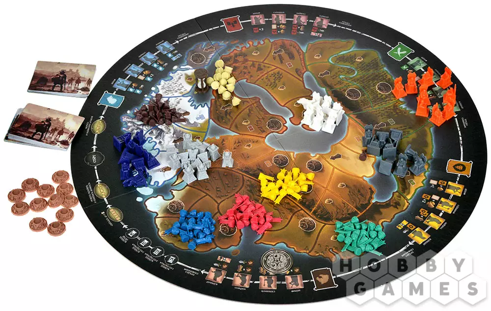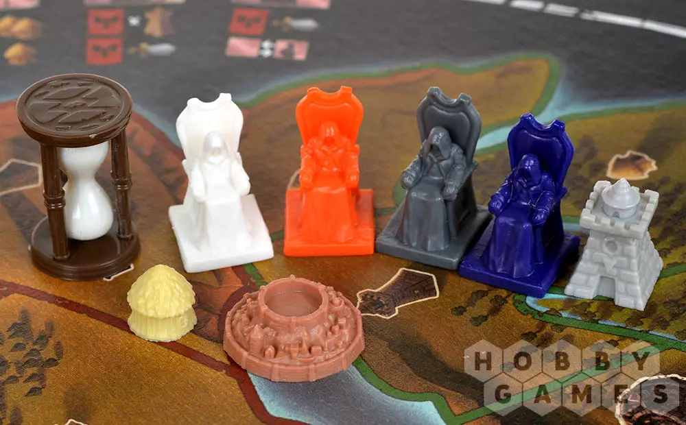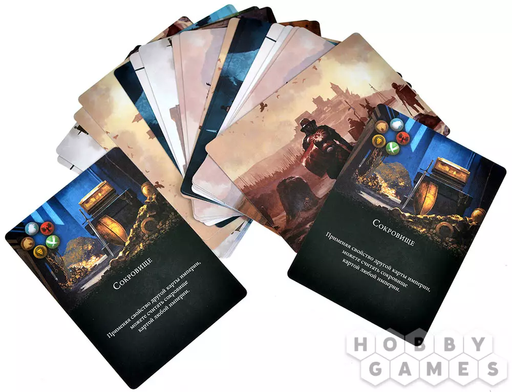 Коллекционное издание игры отличается наполнением: оно содержит 10 карт сокровищ и 10 карт завоеваний, которые замешиваются в колоды империй и придают дополнительную вариативность вашим стратегиям. И какое коллекционное издание без прокачки компонентов? Пластиковые знамёна смотрятся на поле гораздо эпичнее деревянных кубиков, а миниатюры агентов удобнее расставлять в советах империй. Также вы сможете придать дополнительный объём вашей игре с помощью миниатюр городов, фортов и ферм, а трекер раунда в форме песочных часов не позволит вам забыть своевременно его передвинуть.