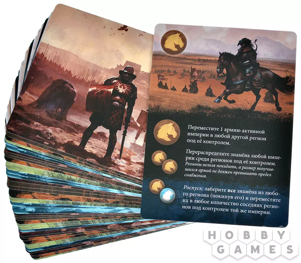 В фазу империй начинаются вестись активные действия: вы можете укрепить занимаемые территории новыми войсками, атаковать соседние земли, находящиеся под контролем другой империи, и взять карты империи – они дают особые преимущества действиям. У вас же должен быть козырь в рукаве, верно? Каждая позиция в совете позволяет сделать что-то определённое, а не всё сразу, поэтому иногда бывает полезно пренебречь очередностью хода в пользу его эффективности.