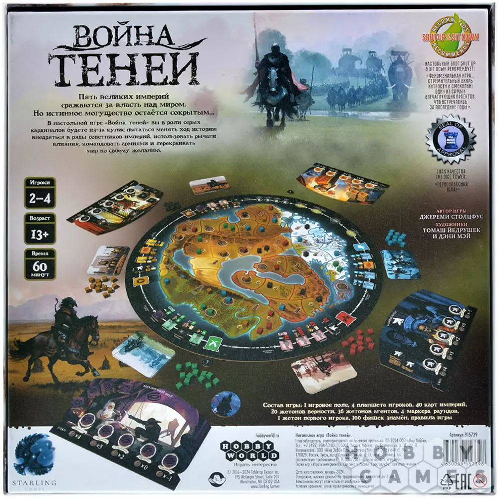 "Война теней" – это стратегическая игра о сражении пяти великих империй за власть над миром. Вы окажетесь в самом центре этих событий, но не в роли сильного правителя одной из держав: под вашим началом будет одно из тайных обществ, что сделало ставку на происходящую войну, дабы извлечь из текущих событий собственную выгоду. В игре вам предстоит оказывать влияние на все империи сразу, отправляя в советы государств своих агентов. Но ваша организация не единственная в своём роде: другие игроки так же будут оказывать влияние на действие держав, а значит, что придерживаться одной стратегии не получится. Искусно меняйте стороны, подтасовывайте карты и манипулируйте событиями, чтобы достигнуть победы в этой "Войне теней"!