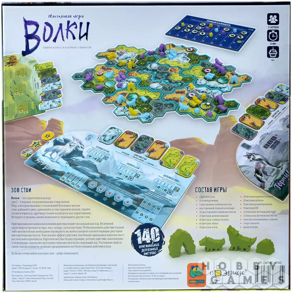 "Волки" – это стратегическая настольная игра о волчьих стаях, борющихся за лесные территории. Игроки возьмут на себя роли вожаков, которые будут управлять стаей. Конечной целью игры является доминирование над другими стаями, но добиться её будет не так просто. Вряд ли у вас получится одолеть дисциплинированную стаю противника парой хилых шакалов, поэтому киньте зов и примите в стаю одиноких волков. Больше ртов – больше пищи требуется: добывайте дичь, чтобы прокормить стаю. А чтобы чужие волки знали, кому принадлежит территория, не забывайте обустраивать лёжки (они ещё и победные очки вам принесут).