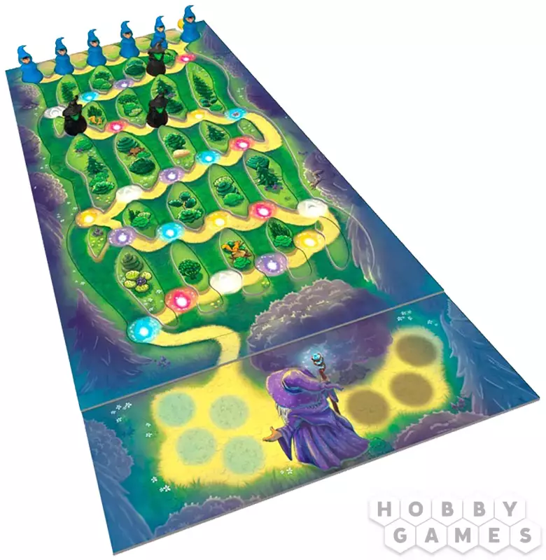 "Волшебные огоньки" – это кооперативная настольная игра для детей, которая привлекает внимание своим оформлением, компонентами и простым, но увлекательным игровым процессом. На игровом поле стоят фигурки учеников волшебной школы и ведьм – все они хотят добраться до дома волшебника быстрее остальных. А идти они будут по тропинкам, которые сделаны неглубокими дорожками. Достаньте из мешочка случайный шарик, поставьте в начало любой тропинки и толкните, чтобы он покатился. Какие фигурки он заденет, те и будут двигаться по тропинке. Но переместятся они на клетку того же цвета, что и шарик, который их коснулся. Принимайте совместные решения, по какой тропинке катить шарики и постарайтесь сделать так, чтобы ведьмам не достался волшебный посох Балдуина!