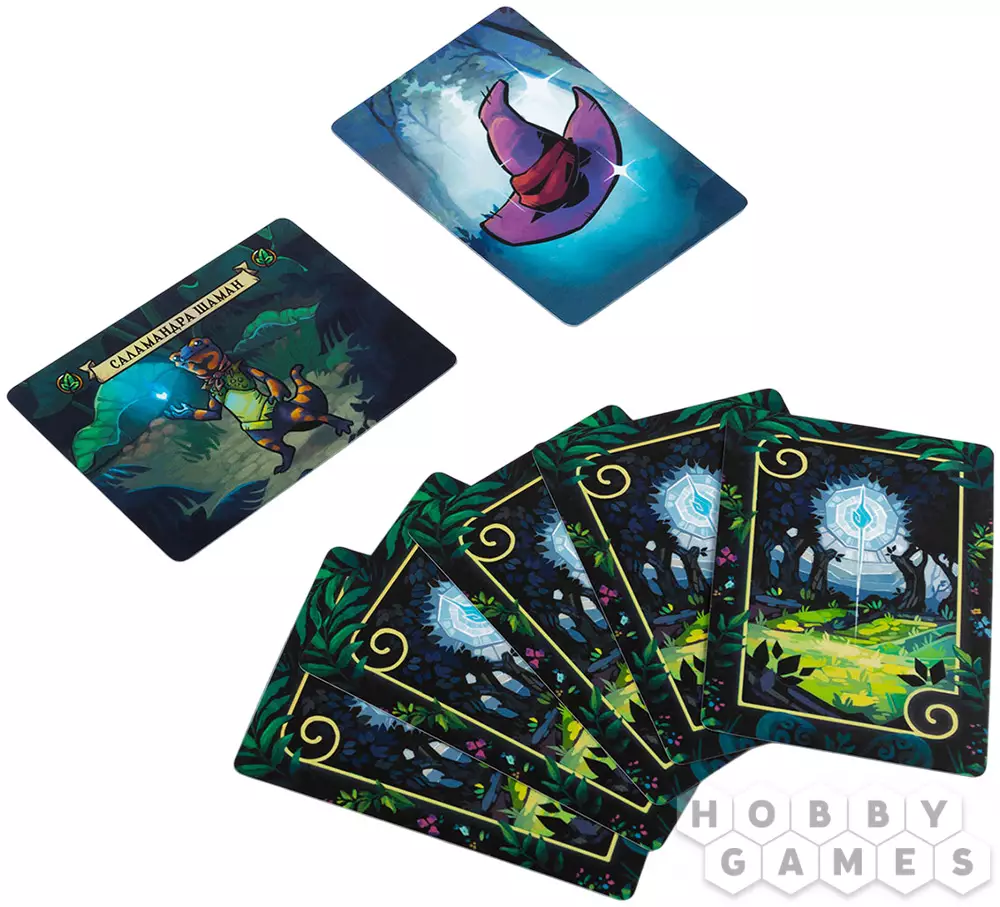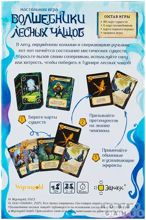 "Волшебники лесных чащоб" – динамичная соревновательная настолка, в которой вы примеряете роли лесных чародеев, стремящихся доказать своё мастерство. В вашем распоряжении – колода карт с уникальными существами, каждое из которых обладает силой и особыми эффектами. В каждом раунде вы будете призывать претендента – существо, которое сразится за звание чемпиона, а затем усиливать его с помощью дополнительных карт. Фазы поиска, призыва и усиления создают напряжённую и стратегическую борьбу, где важно не только набрать силу, но и перехитрить соперников. Игра предлагает множество вариантов развития событий благодаря разнообразию существ и их эффектов, а также отлично масштабируется: от двух до шести игроков в одной коробке и до двенадцати – при объединении двух наборов.