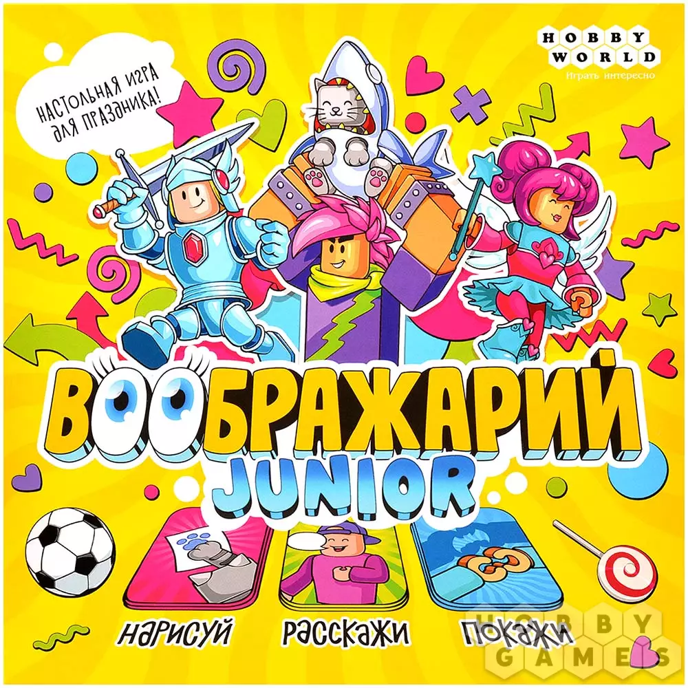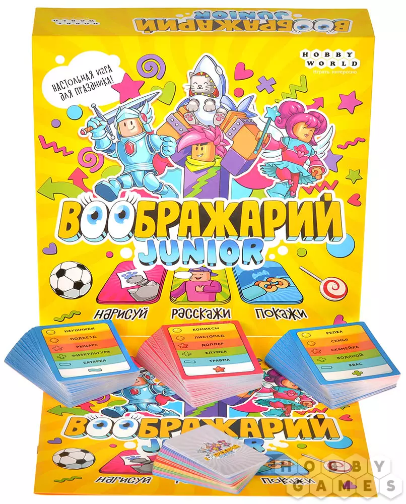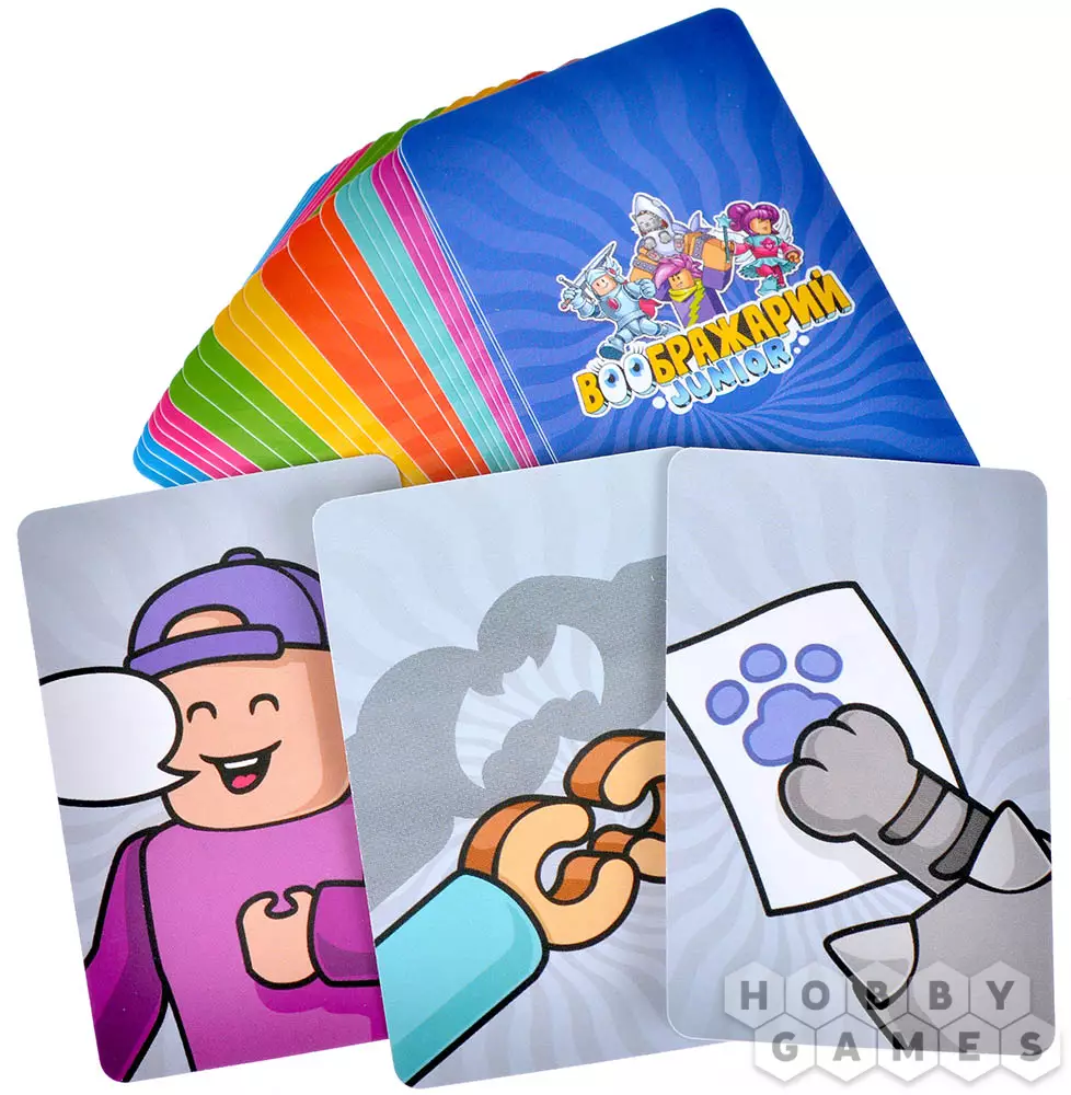 "Воображарий Junior" – это новый представитель в отличной серии настольных игр, построенных на ассоциациях. На этот раз игра была разработана специально для детей от шести лет и старше. Это отражается в адаптированных правилах, дизайне и, конечно, более подходящем наборе слов на карточках. Не бойтесь, что слова станут слишком простыми – игра предлагает два уровня сложности, где среди простых заданий вы встретите слова тип "мультфильм", "детский сад" или "микроб", а среди сложных "гордость" или "блокада".
