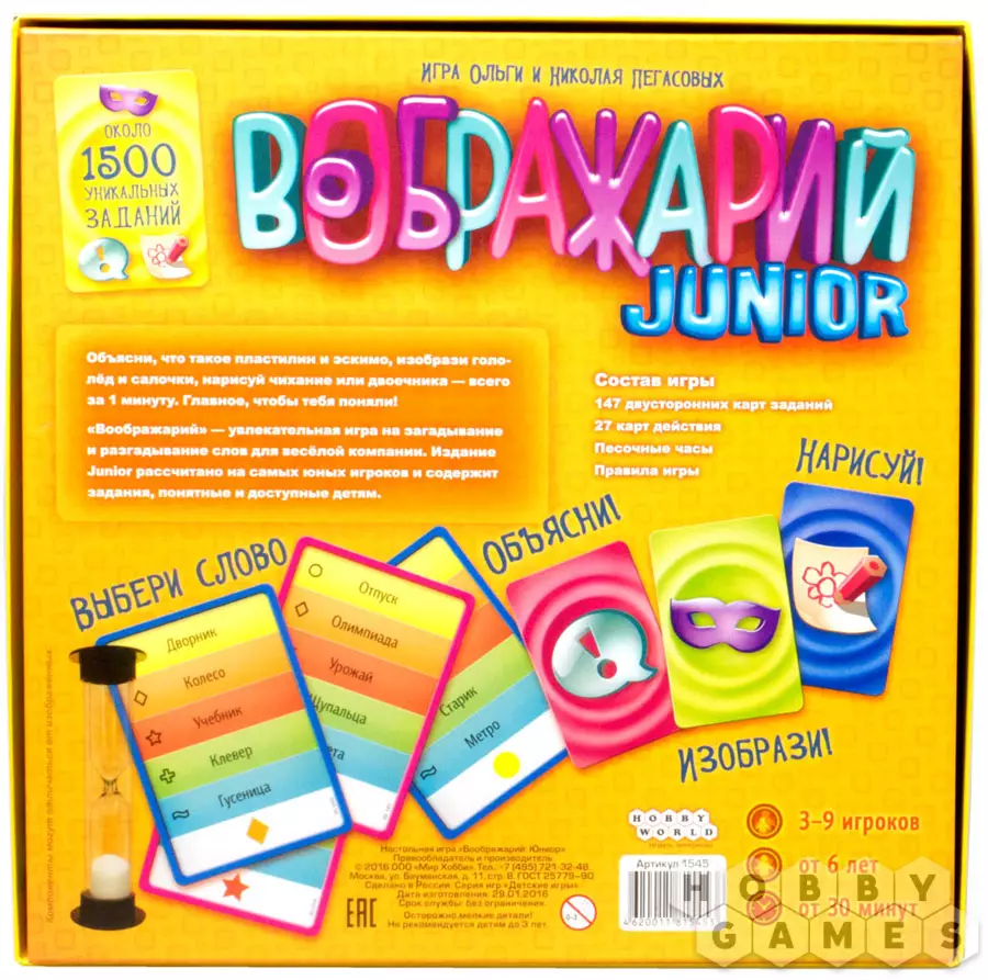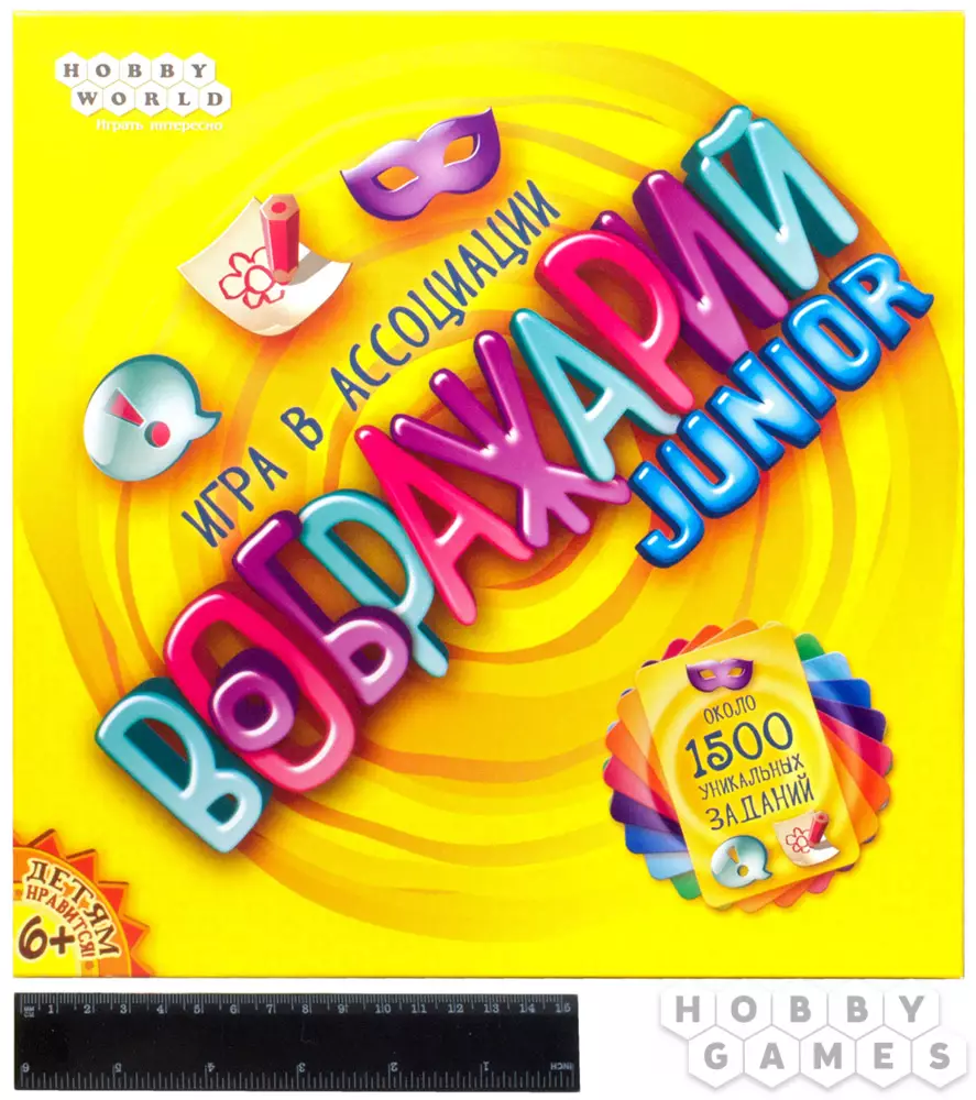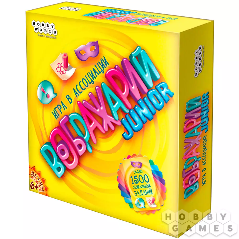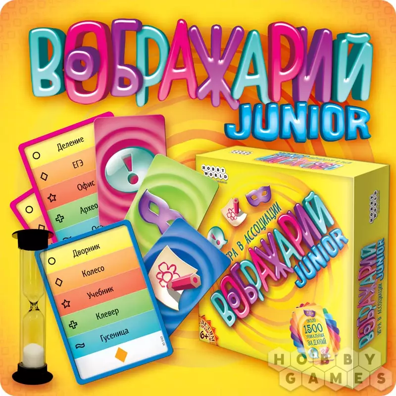 "Воображарий Junior" – это новый представитель в отличной серии настольных игр, построенных на ассоциациях. На этот раз игра была разработана специально для детей от шести лет и старше. Это отражается в адаптированных правилах, дизайне и, конечно, более подходящем наборе слов на карточках. Не бойтесь, что слова станут слишком простыми – игра предлагает два уровня сложности, где среди простых заданий вы встретите слова тип "мультфильм", "детский сад" или "микроб", а среди сложных "гордость" или "блокада".