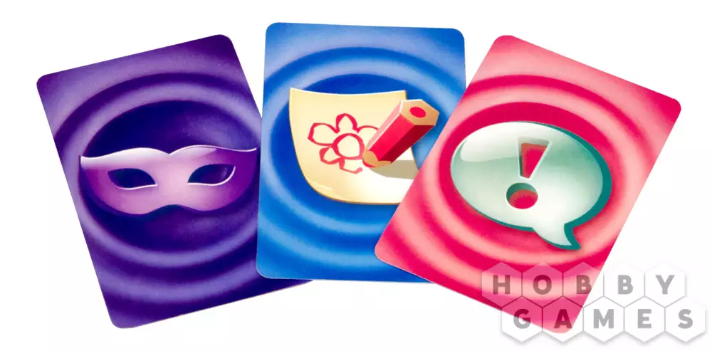 Помимо этого, в отличие от других игр, все три варианта объяснений слова будут чередоваться. Происходит это очень просто. В начале игры у вас есть три карты, символизирующие все три варианта: Рассказ, Рисунок, Представление. В свой ход вы "тратите" одну из них, выбирая более удобный вам способ. В ваш следующий ход вам будет доступно только две оставшиеся карты. Когда выйдут все три – они возвращаются и у вас снова есть выбор из трёх способов объяснить.