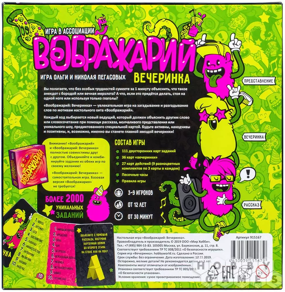 Многим полюбившаяся настольная игра "Воображарий" теперь вышла в новом формате "Воображарий: Вечеринка". Это игра в ассоциации, где каждый из игроков старается набрать наибольшее количество очков отгадывая или показывая указанные слова или словосочетания. С помощью этой игры вы сможете весело провести вечер с друзьями и близкими и узнать друг друга поближе. Теперь в игру добавляется новый способ объяснения слов или словосочетаний, описанных на 36 карточках "вечеринки". Играть в ассоциации теперь ещё веселее!
