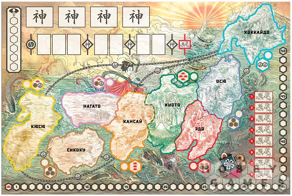 Вся игра длится три раунда, точнее три сезона, а с приходом зимы партия завершается, и побеждает игрок с наибольшим количеством победных очков. Очки можно зарабатывать множеством различных способов: очки даются за смерть воинов, взятие заложников, за захваты провинций, карты, храмы и многое другое. Проявите главные качества настоящего лидера, будьте мудрыми и рассудительными, заключайте выгодные соглашения, не забывайте про свою честь. Помните, что когда придёт время, только один Дом будет править Японией…