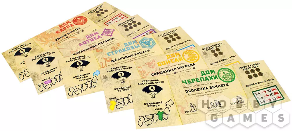 Вся игра длится три раунда, точнее три сезона, а с приходом зимы партия завершается, и побеждает игрок с наибольшим количеством победных очков. Очки можно зарабатывать множеством различных способов: очки даются за смерть воинов, взятие заложников, за захваты провинций, карты, храмы и многое другое. Проявите главные качества настоящего лидера, будьте мудрыми и рассудительными, заключайте выгодные соглашения, не забывайте про свою честь. Помните, что когда придёт время, только один Дом будет править Японией…