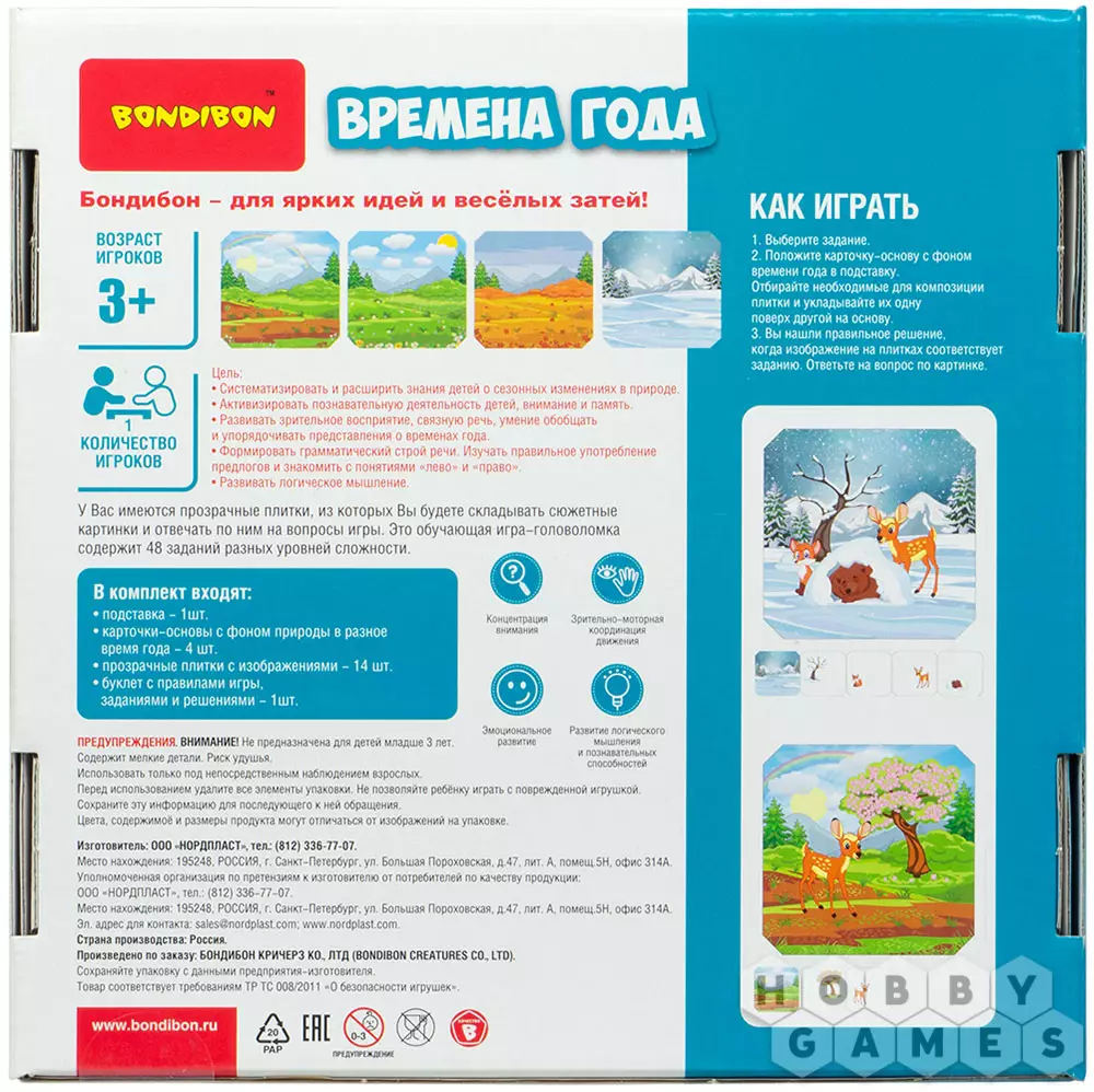 Познавательная настольная игра "Времена года" познакомит вашего ребёнка с природными явлениями, объяснит, когда и в какой период они происходят, а ещё расскажет о поведении животных в каждое из времён года. В игре есть 48 заданий различных уровней сложности: ребёнку предстоит самостоятельно выкладывать картинку времени года, согласно выполняемому заданию. Играя, ребёнок будет лучше познавать окружающий мир.
