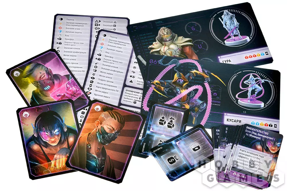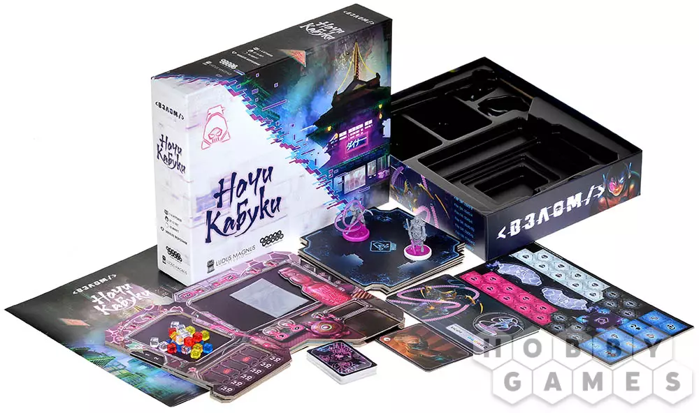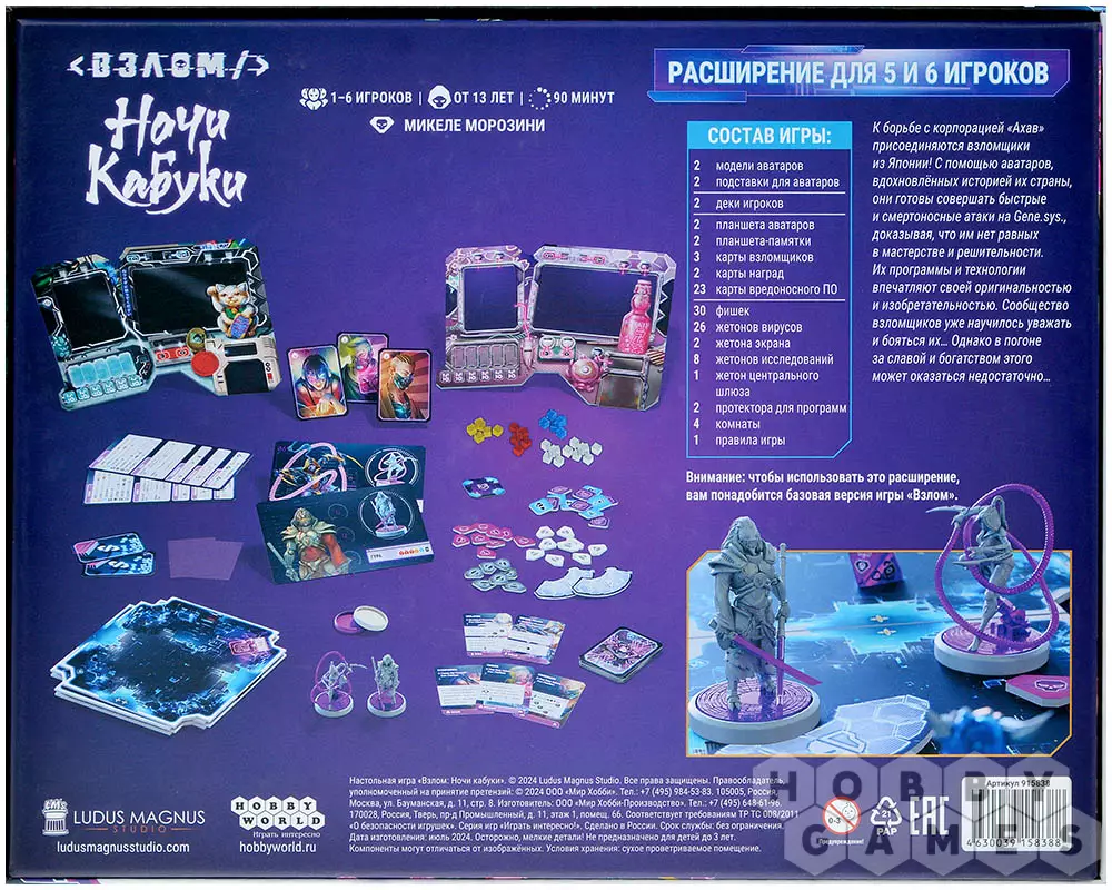 "Взлом: Ночи кабуки" – это расширение для 5 и 6 игроков к соревновательной настольной игре "Взлом". Вы станете счастливыми обладателями дополнительных детализированных 3D-аватаров и карт вредоносного ПО – теперь в тематике невероятной Японии. А вместе с ними у вас появится возможность расширить игровое поле, добавив новые комнаты и получать уникальные награды. Все нововведения можно использовать в любом игровом режиме и в сочетании с другими дополнениями. Теперь гонка за единоличное владение информацией станет ещё ожесточённее, а дух соперничества – сильнее!