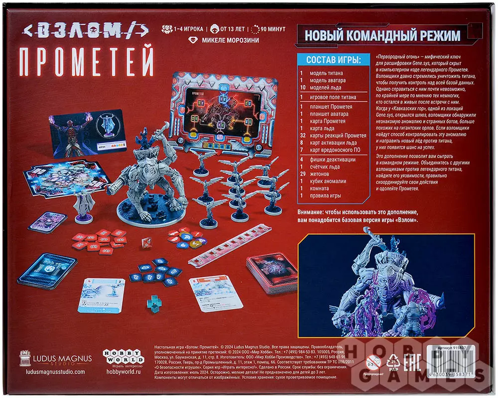 "Взлом: Прометей" – это дополнение, которое совершенно меняет уже ставший привычным соревновательный ход "Взлома" и открывает вам кооперативный режим. Теперь у вас появится возможность и даже необходимость сплотиться со своими друзьями и действовать сообща. Как и в базовой версии, у каждого из вас будет свой детализированный 3D-аватар и карта взломщика. Помимо главного врага Прометея, представленного в виде роскошной фигурки, вам по-прежнему придётся сражаться с более слабыми врагами – его прихвостнями. Однако правильная стратегия и грамотное распределение сил в команде позволят вам с лёгкостью устранить всех, кто окажется на вашем пути к главной цели – "Первородному огню", который хранится в компьютерном коде Прометея и является ключом к расшифровке базы данных. Скорее объединитесь с союзниками и доведите свою миссию до конца!