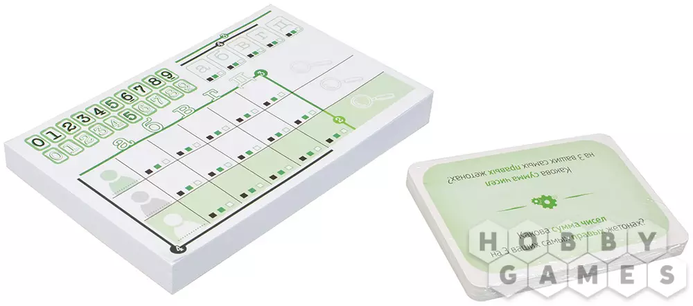Для решения данной задачи используются карточки с вопросами, которые вы будете задавать своему оппоненту: с их помощью можно узнать, например, сумму всех цифр шифра соперника, а также на каком месте в шифре находится двойка и есть ли она вообще. Вы играете по очереди, задавая друг другу один из шести доступных вопросов, после чего фиксируете полученную информацию на специальный лист, сбрасываете использованную карточку вопроса и кладёте на её место новую из колоды.