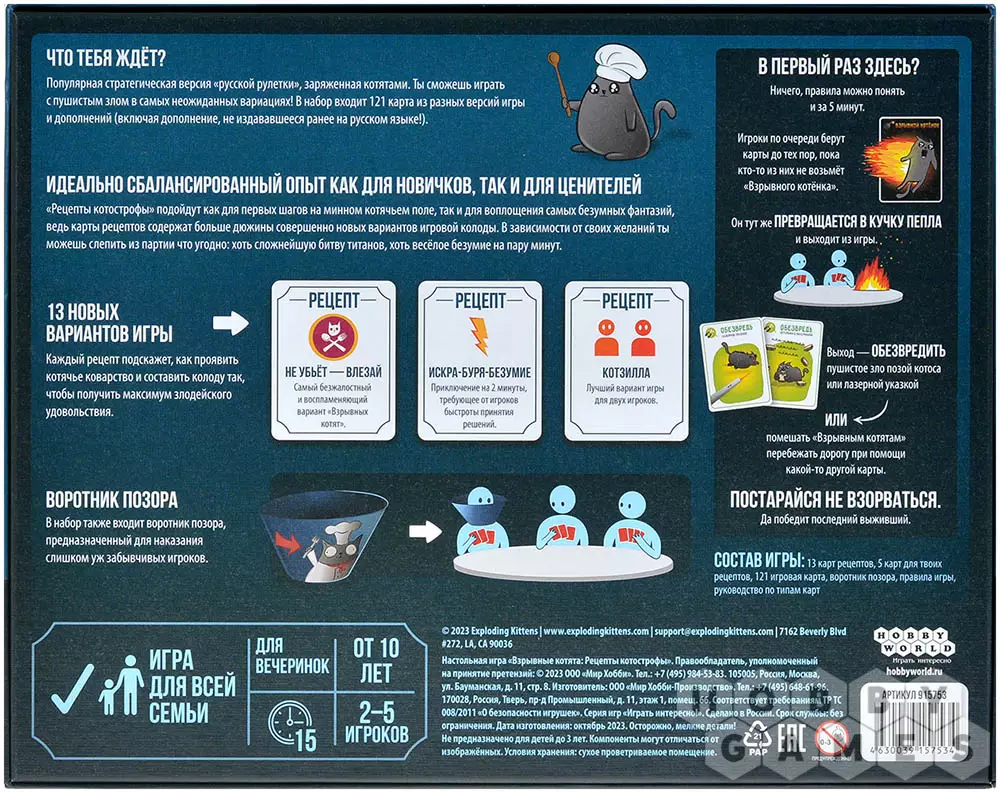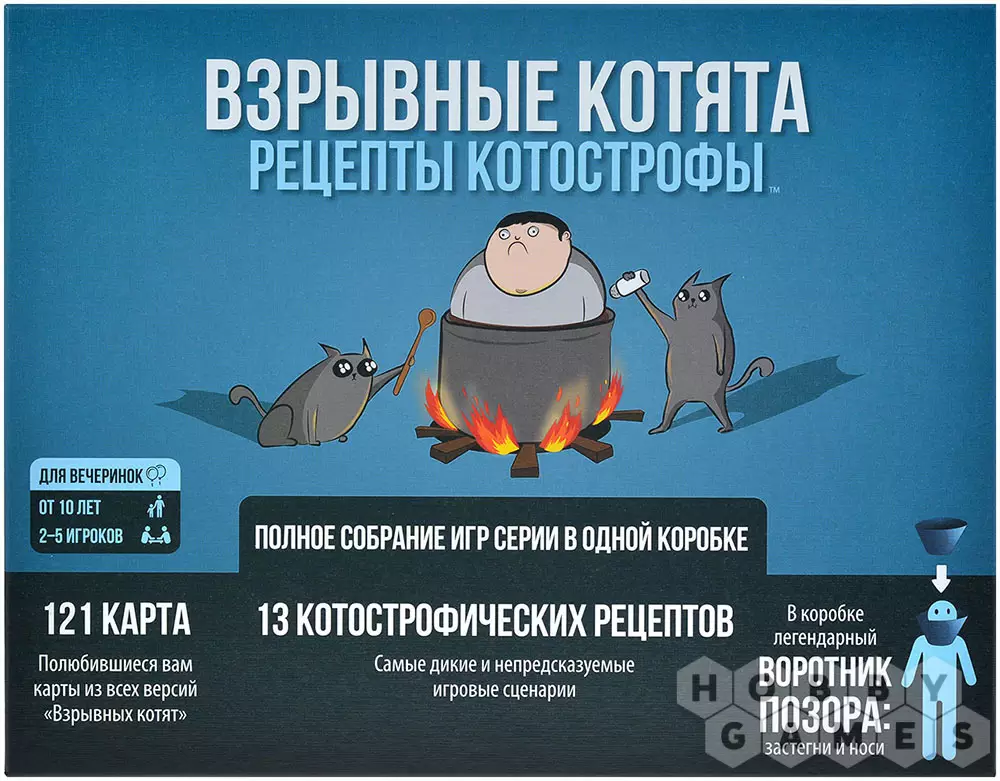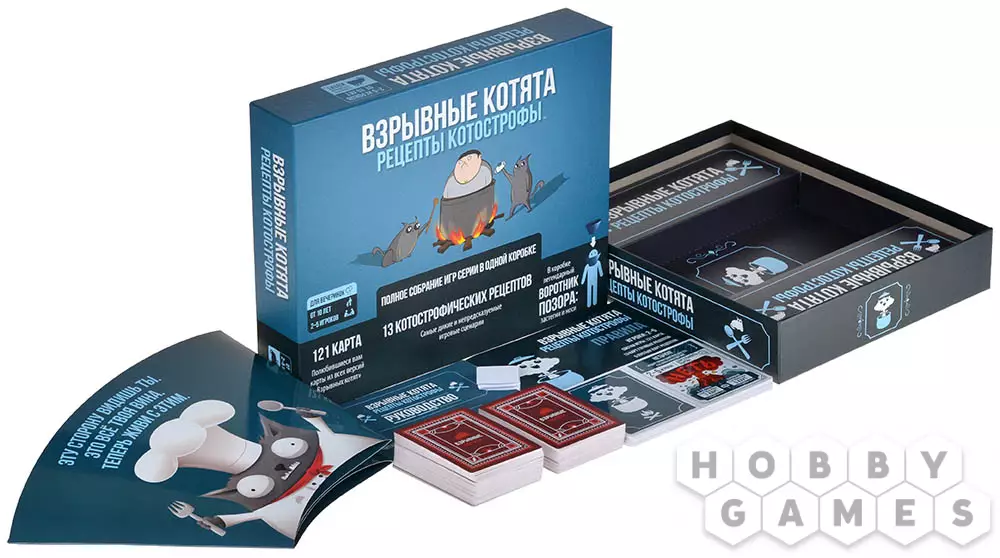 Константин19.07.2024 18:17Игра понравилась. Эта коробка вмещает в себя базовую версию ,кроме карт подлижись, кошки картошки, кота арбуза (как я понял заменен на зомби кота из взрослой версии), разрывные котята , лающие котята , кроме кот-короны силы и всех связанных с ней карт, и дополнение, которого нет на русском языке - это бесстыжие котята с классной механикой . Картинки очень смешные и классные с интересным дизайном, но несколько картинок заменили, некоторые взяты из взрослой версии, а точнее их цензурная версия. Понравился баланс разных режимов игры (рецептов) , но как по мне возможность создать свой рецепт на пустой карте рецептов идея не очень. Разочаровал тот факт, что в нашей локализированной версии нет органайзера для различных типов карт. Сама игра интересная ,динамичная , веселая и заслуженно получает звание хита.