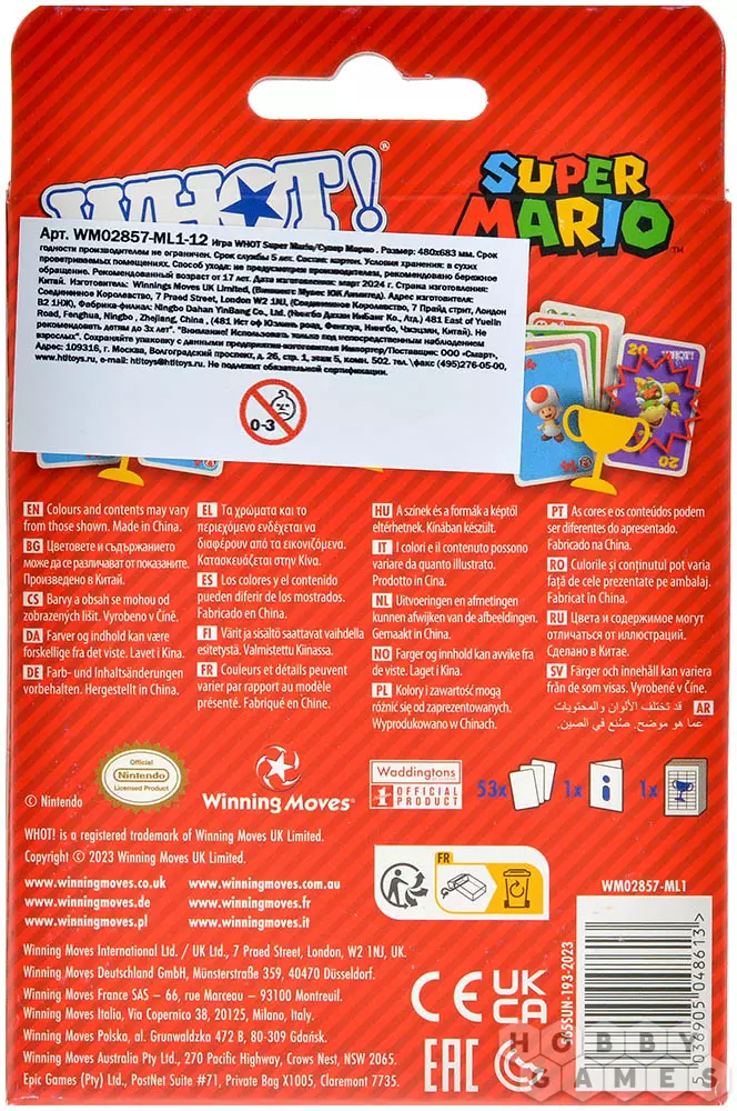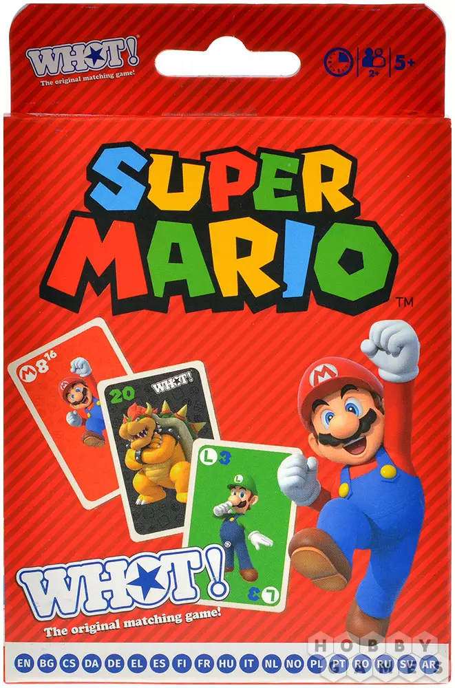 Добро пожаловать в Грибное королевство! "WHOT! Супер Марио" вдохновлён классической настольной игрой на поиск соответствий чисел и цветов "Уно" и видеоигрой Super Mario. Правила просты: друг за дружкой сравнивайте фигуры, цифры и персонажей на картах и первым сбросьте последнюю карту!
