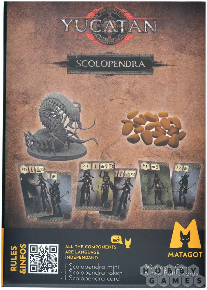В дополнении Scolopendra вы сможете заручиться поддержкой ещё одного мифического существа – гигантской сколопендры. Также в комплекте вас ждут 6 новых карт боя и 30 реалистичных жетонов кукурузы, выполненные из пластика. Придайте своим битвам за Юкатан ещё больше атмосферности!