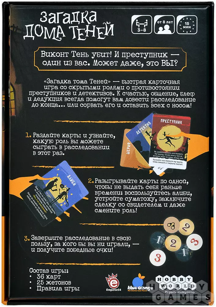 Для победы вам понадобятся острый ум, мастерство блефа и искусство убеждения. Только с их помощью вы сможете разгадать тайну и довести дело до конца… или умело запутать остальных, сорвав расследование и оставив всех в полном замешательстве. Вы готовы к интеллектуальному поединку?