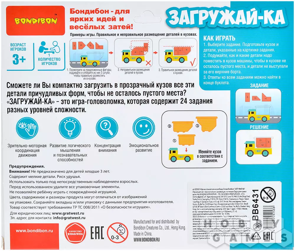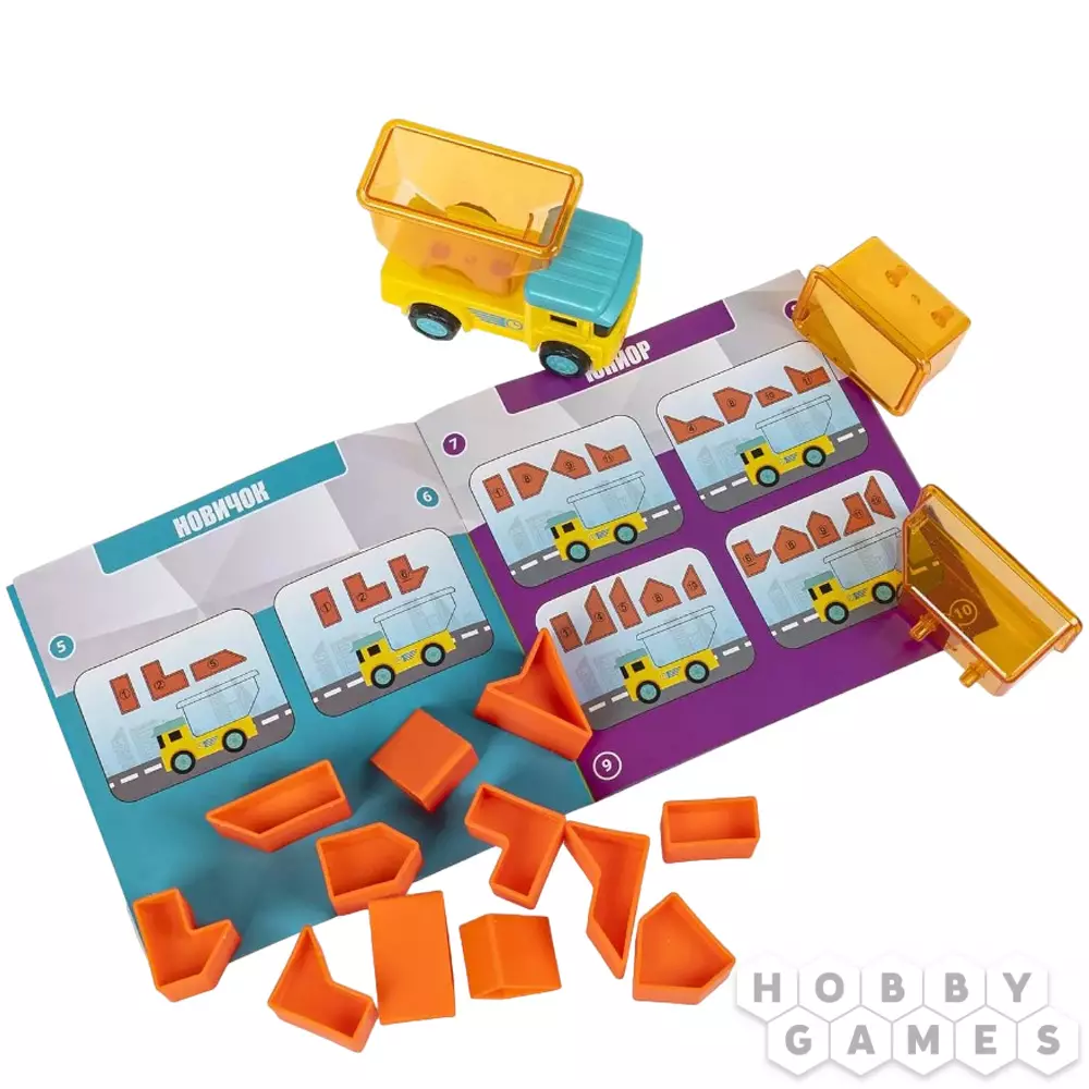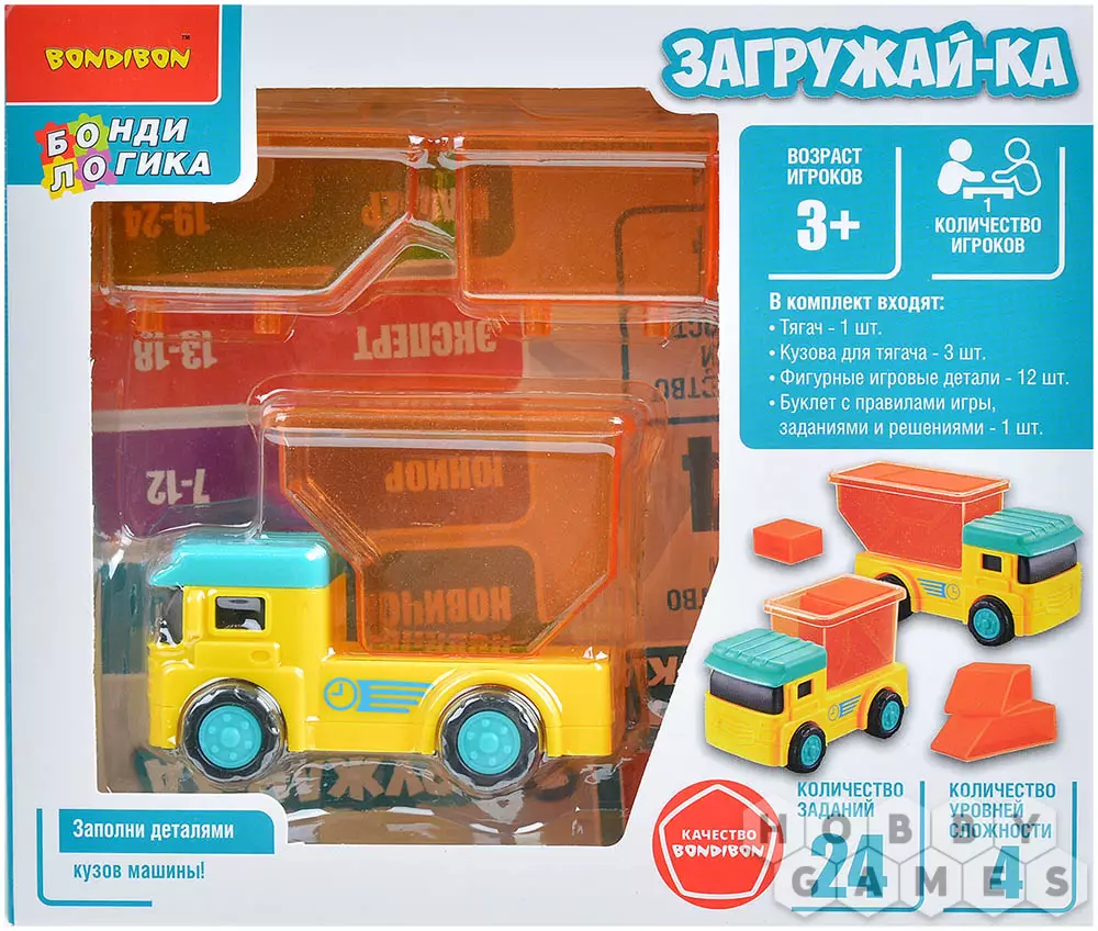 "Загружай-ка" – это игра-головоломка для малышей в стиле тетриса, которая прекрасно развивает логику, пространственное мышление и внимательность. Ваша цель – уложить весь груз в тягач так, чтобы целиком заполнить пространство кузова и чтобы из него ничего не торчало – вы ведь не хотите, чтобы ценная доставка вывалилась по пути? В комплекте идут 24 задания разного уровня сложности. В соответствии с выбранным заданием возьмите нужный кузов и необходимые детали и приступайте к складированию! Получится ли у вас укомплектовать всё в соответствии со стандартами качественной грузоперевозки?