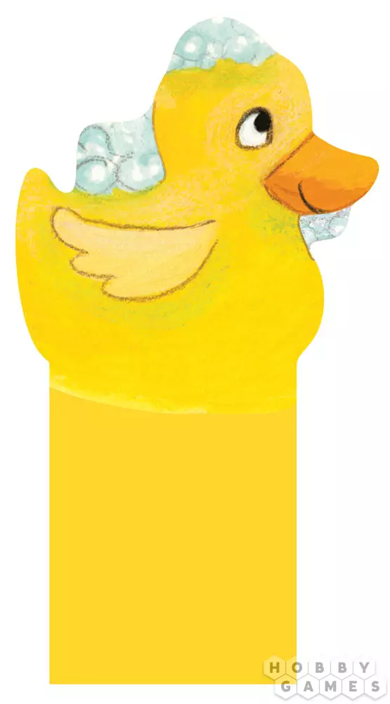 Сначала необходимо собрать специальную "ванночку" с прорезями для уточек и Зайки, а также отобрать жетоны. На жетонах изображены различные игрушки трёх цветов: жёлтого, синего и красного.