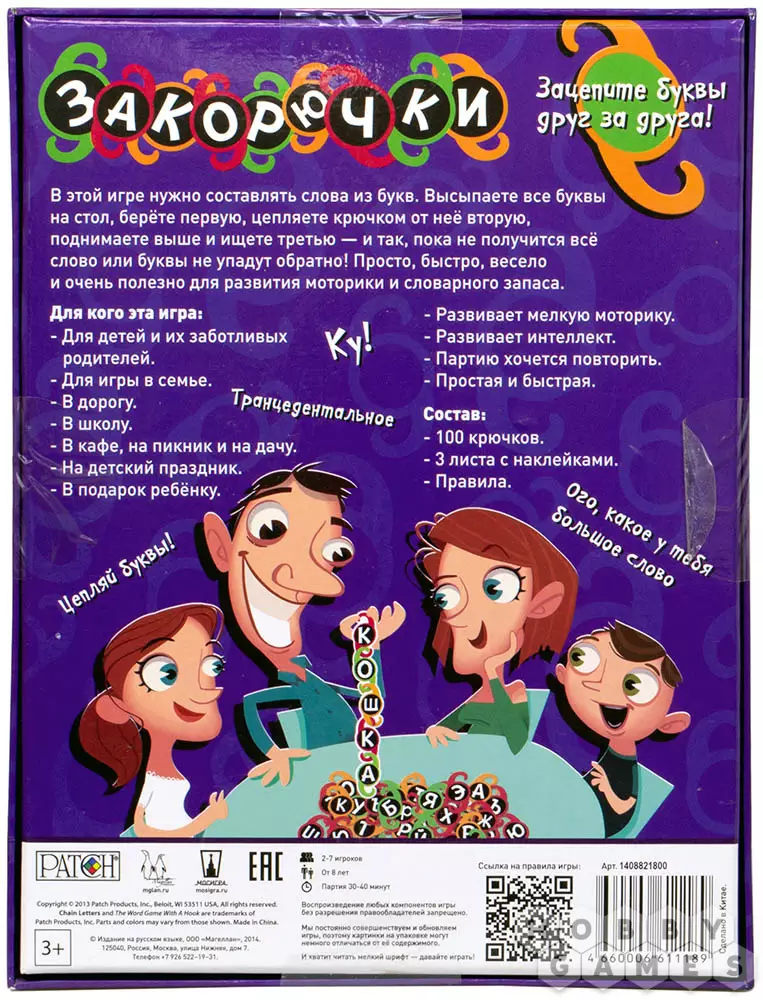 Эта простая, быстрая и весёлая игра прекрасно подходит для детей разного возраста, развивает мелкую моторику и словарный запас. Благодаря удобной коробке вы всегда сможете взять её с собой в дорогу, в гости, в школу, на пикник или на дачу. И каждую партию по сбору разнообразных слов вам обязательно захочется повторить!