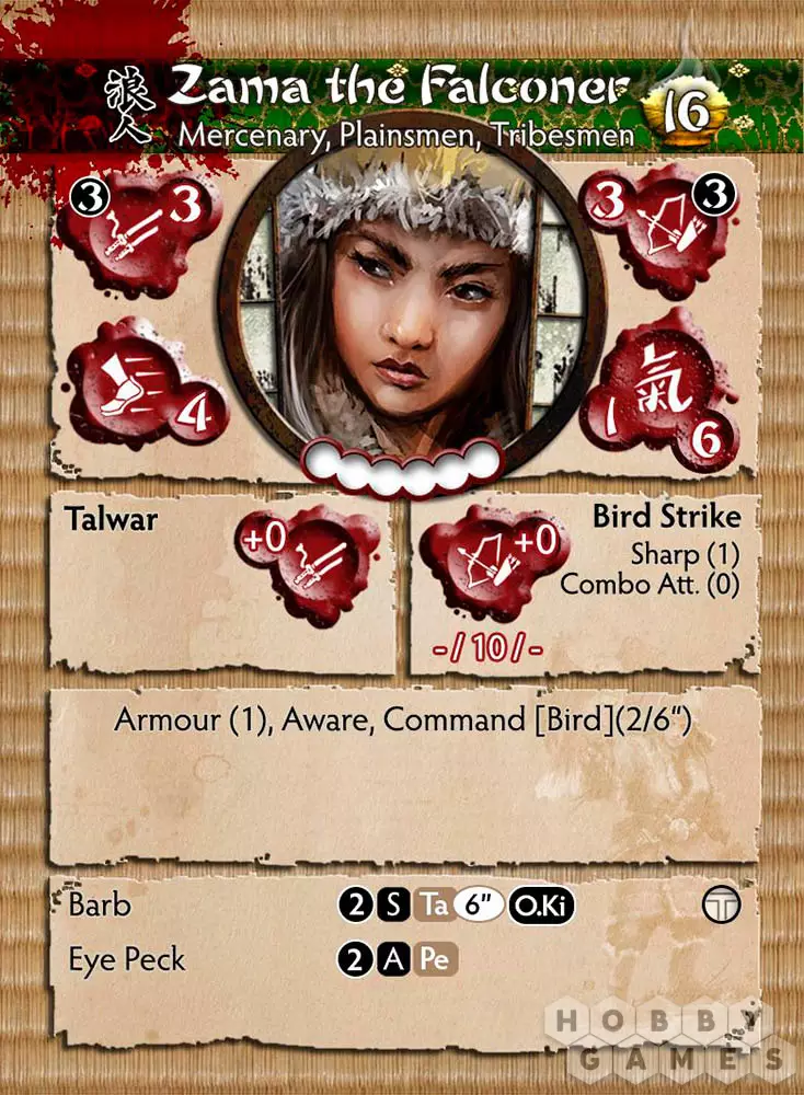Zama из племени, живущего на великих равнинах к северу от материка. Когда-то её люди воевали с Empire, а теперь отдают дань уважения императору Emperor Song и нанимаются на службу. Zama и её племя контактировали с Shiho Hiroto, когда он путешествовал за границу, и, как рассказывает история из другого времени, они стали связаны с ним узами крови и чести. Она и несколько ей подобных сейчас находятся в Jwar, готовые выплатить долг. Обладая властью над своими грозными орлами, она является союзником Tengu, которого она уважает и знает по своему прошлому. Zama – несравненный мастер птиц. Она управляет крылатыми, оставаясь в безопасности. Столкнувшись с крупной добычей, орлы выклёвывают глаза, позволяя союзником прикончить их без боя. Будучи охотником, Zama также использует ловушки. Она может поймать противника колючей верёвкой.