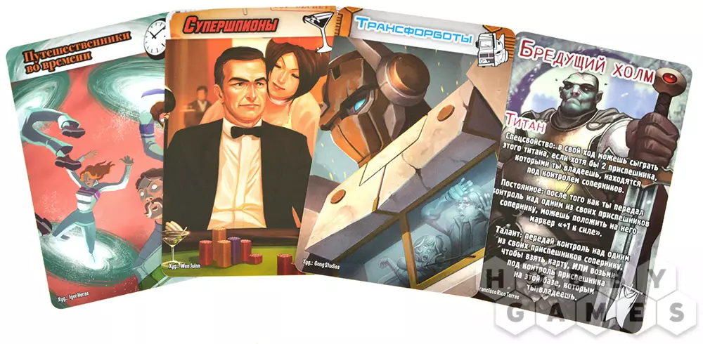 Сами по себе титаны принципиально отличаются от любых других карт в игре. В начале игры титаны лежат рядом со своими владельцами на столе – при этом они не могут попасть ни в руку, ни в колоду, ни в стопку сброса. Они для такого слишком круты.