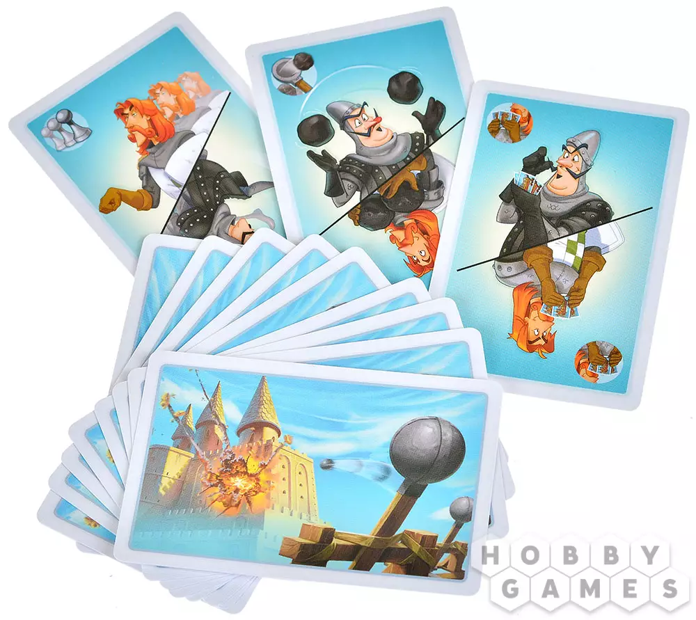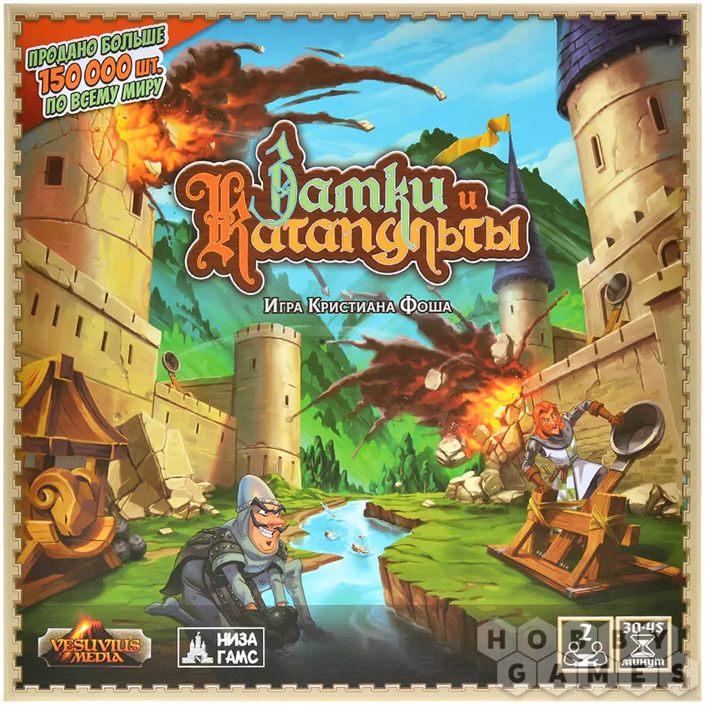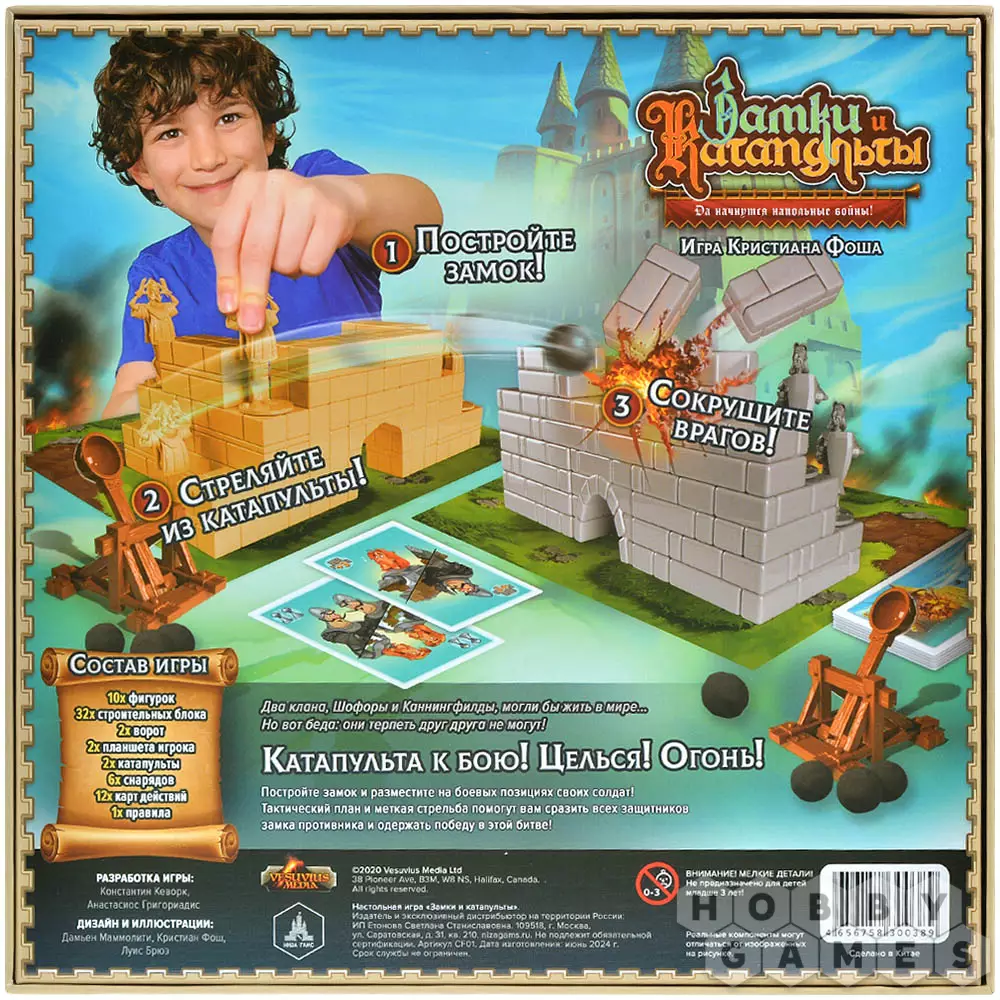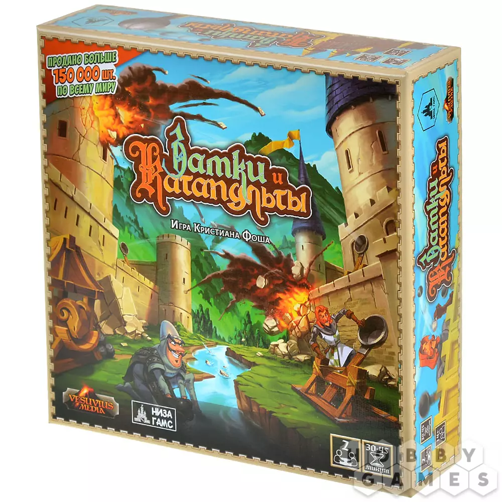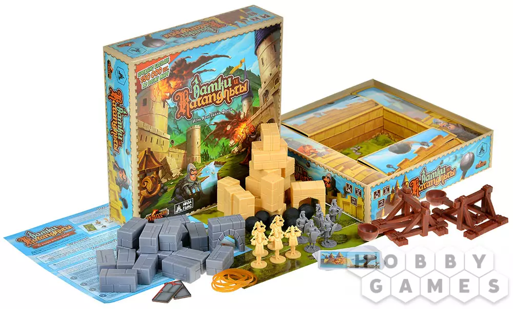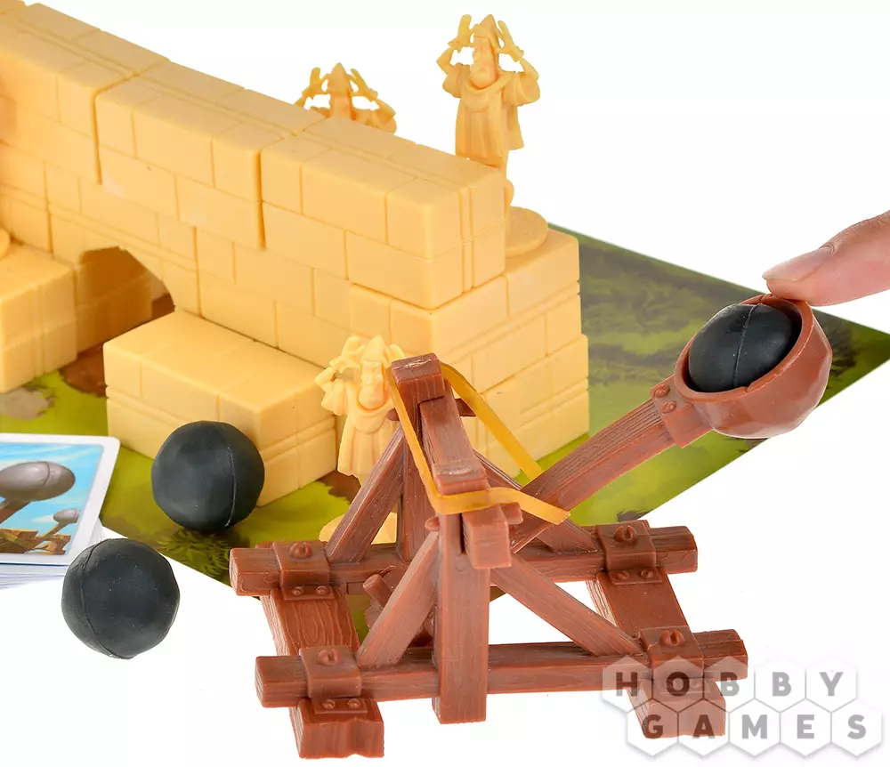"Замки и Катапульты" – это семейная интерактивная игра, в которой двум игрокам предстоит возвести укрепления из строительных блоков, расставить по ним фигурки своих солдат и начать катапультную артподготовку (контемпорари арт тут ни при чём!) перед наступлением. Они будут расстреливать замки друг друга и разыгрывать карты действий, ремонтируя укрепления, производя залпы, воруя эти карты друг у друга и склоняя солдат противника к предательству. Выиграет тот, кто выведет из строя всю армию противника.