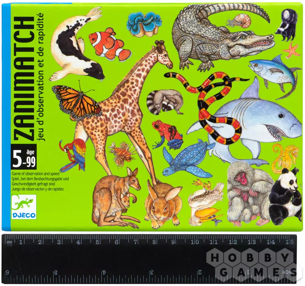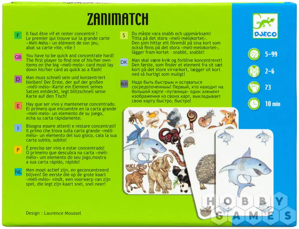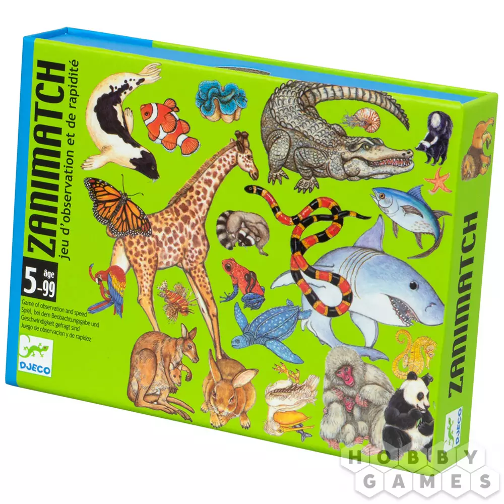 Увлекательная карточная игра Zanimatch с яркими иллюстрациями животных будет интересна детям с пяти лет. В игре присутствуют большие карты со множеством животных, они называются "путаницы". Перед игрой всем участником раздаются по 8 карточек с животными, а в центре стола кладутся "путаницы". Нужно быстрее других игроков найти животных со своих карт на большой карте, чтобы скинуть карты в сброс. Цель игры – первым остаться без карт или с наименьшим количеством карт, когда все "путаницы" будут разыграны. Это не только соревновательная, но и познавательная игра, ведь дети смогут изучить больше 50 животных!